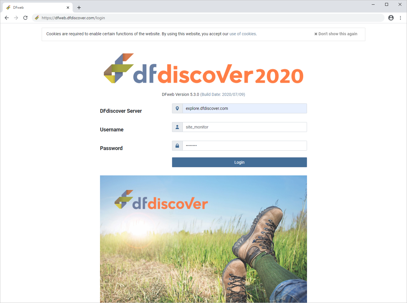 Open a web browser and navigate to https://dfweb.dfdiscover.com/login, verify the version information: DFweb Version 5.3.X is displayed.