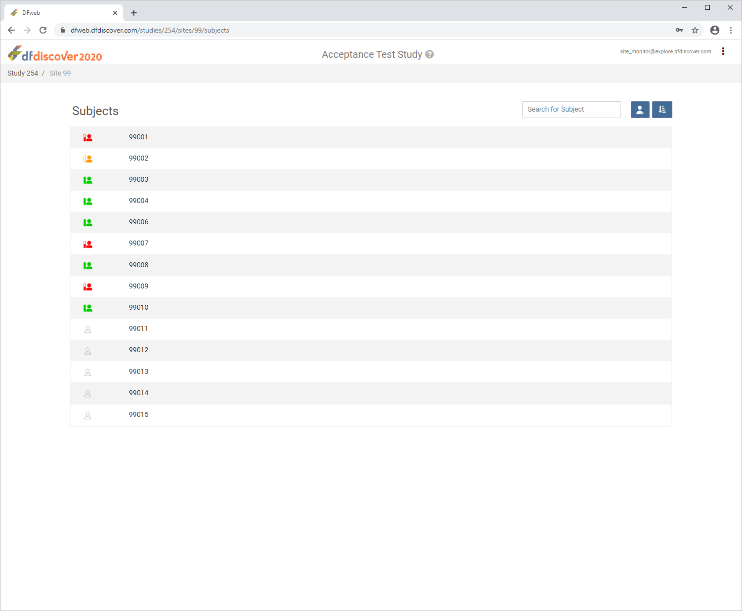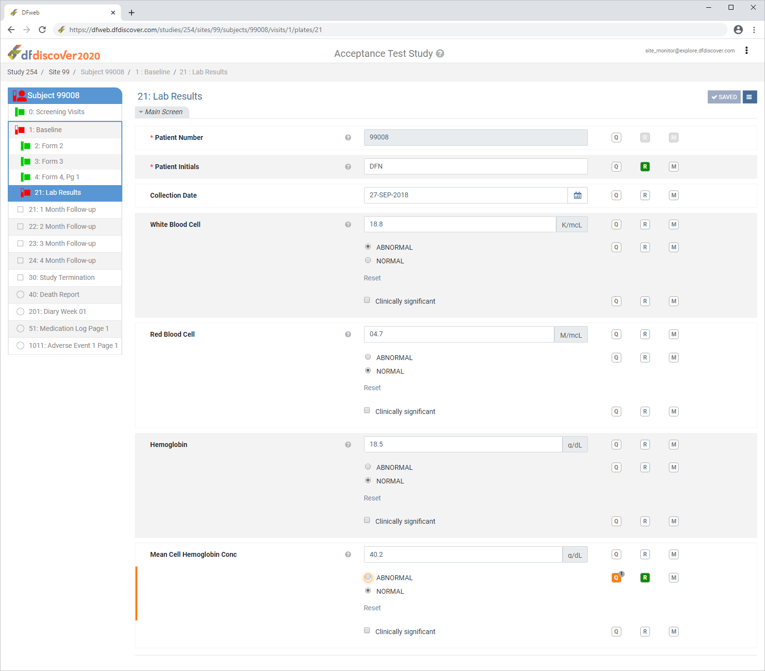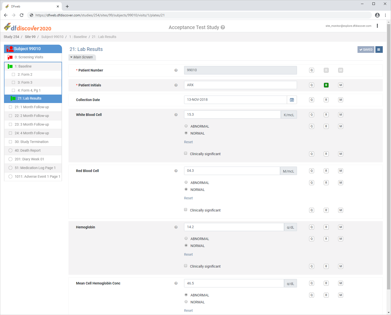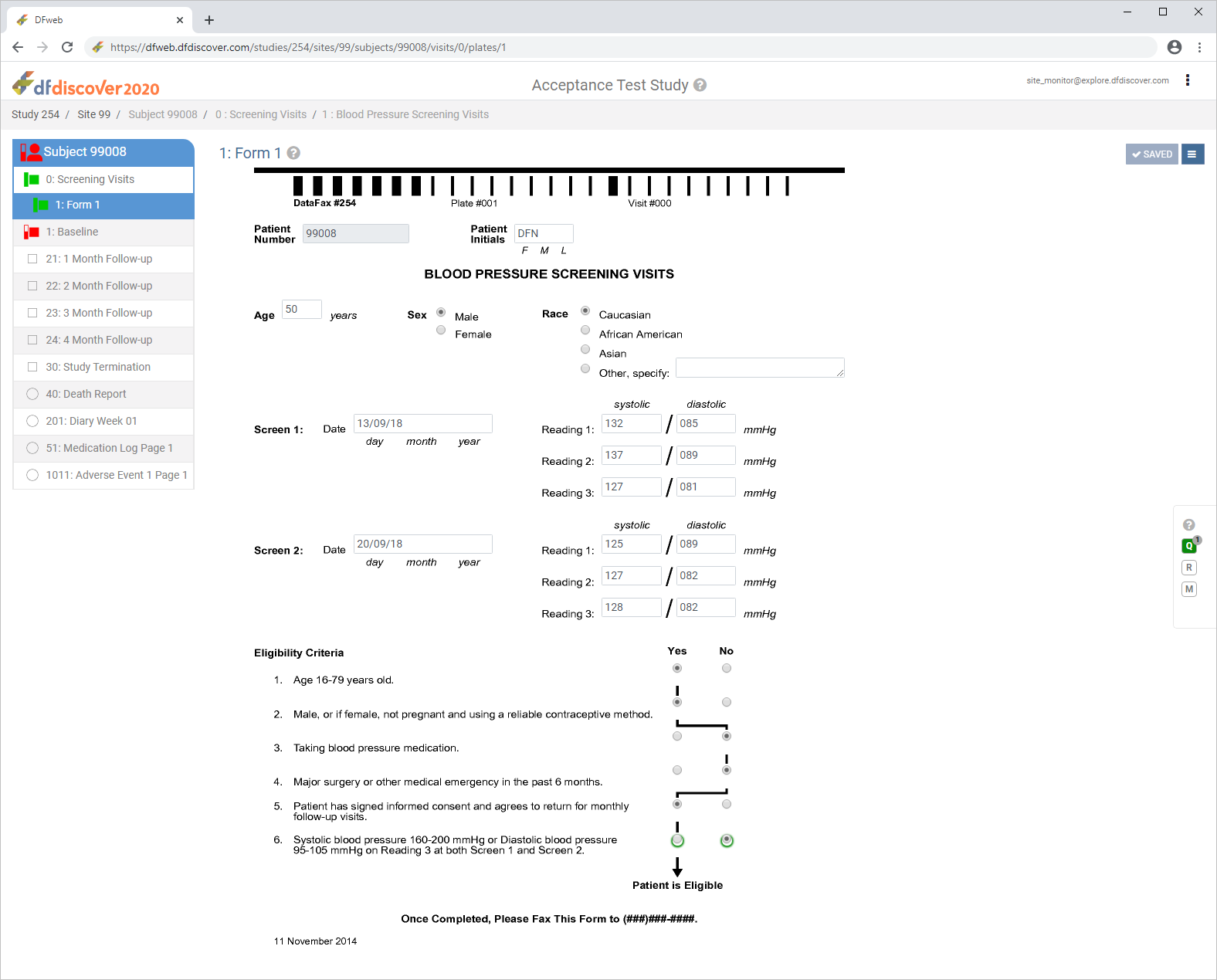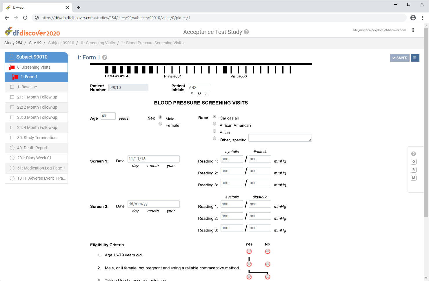 From the Subjects list, click Subject 99010 to open the 0: Screening Visits 1:Form 1 page.