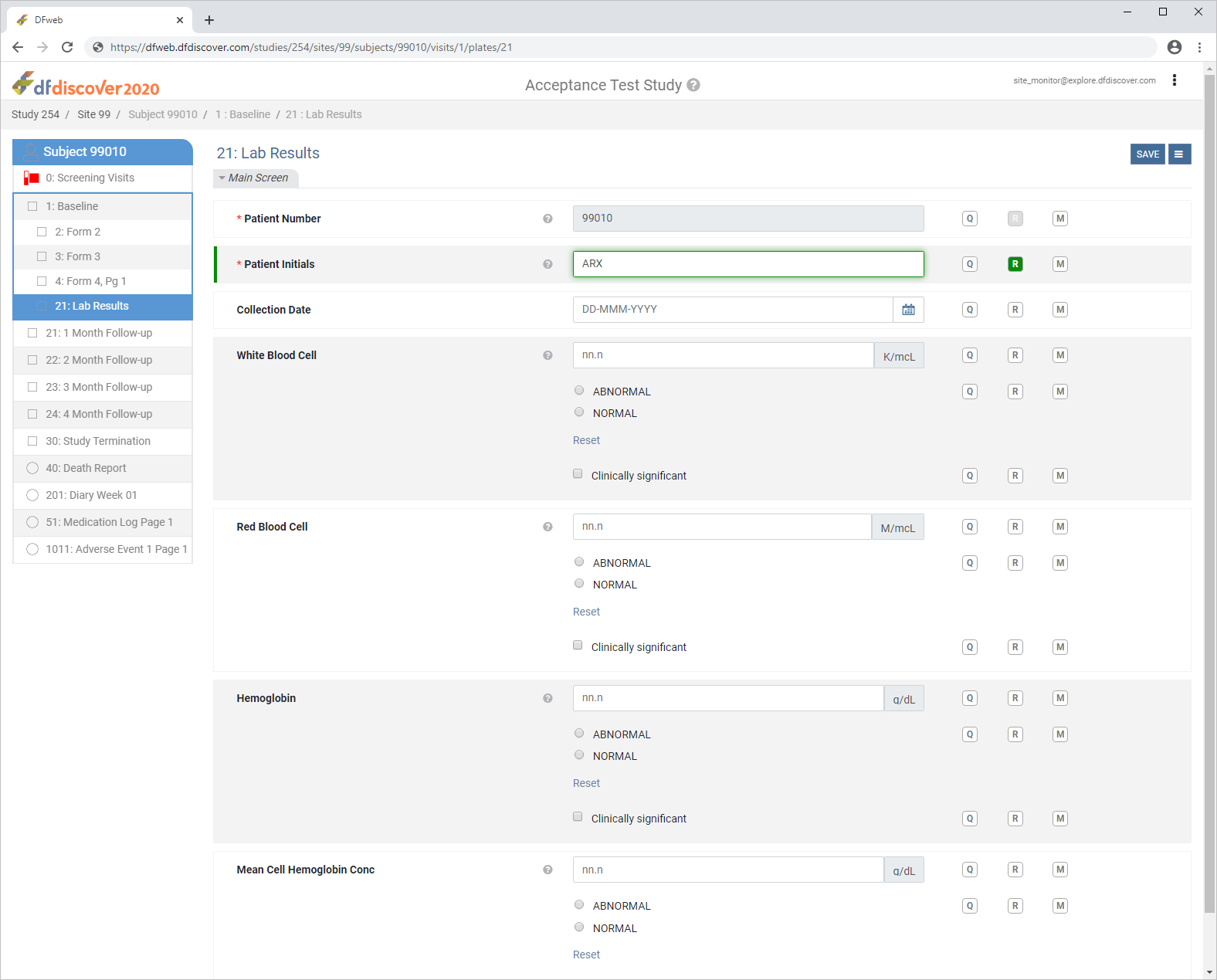 Select 1:Baseline > 21:Lab Results page. Click Patient Initials field.