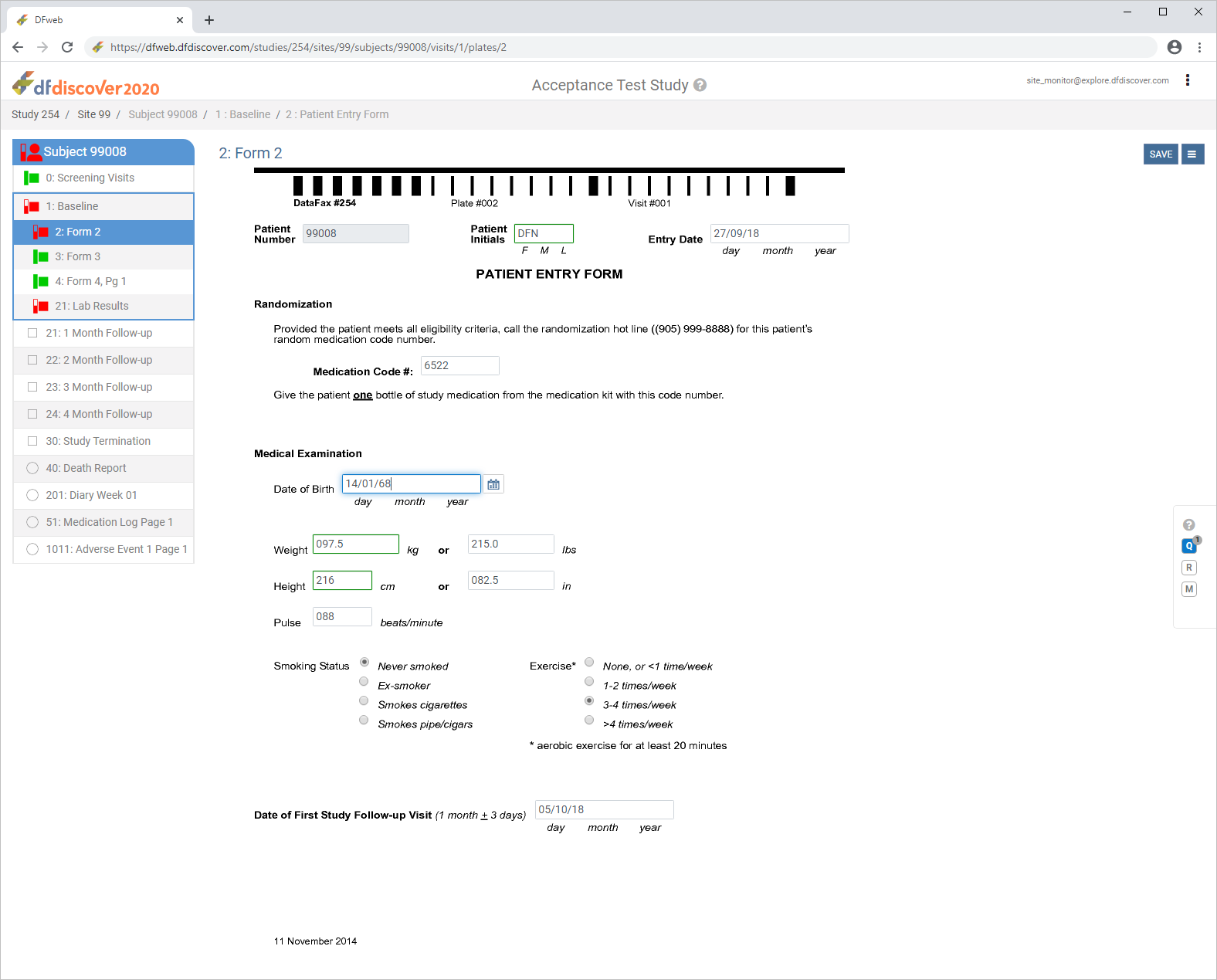 Click 1: Baseline, and 2: Form 2 becomes the active form. Correct Date of Birth (dd/mm/yy) to 14/01/68.