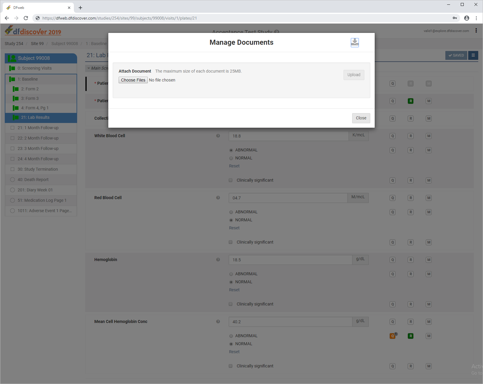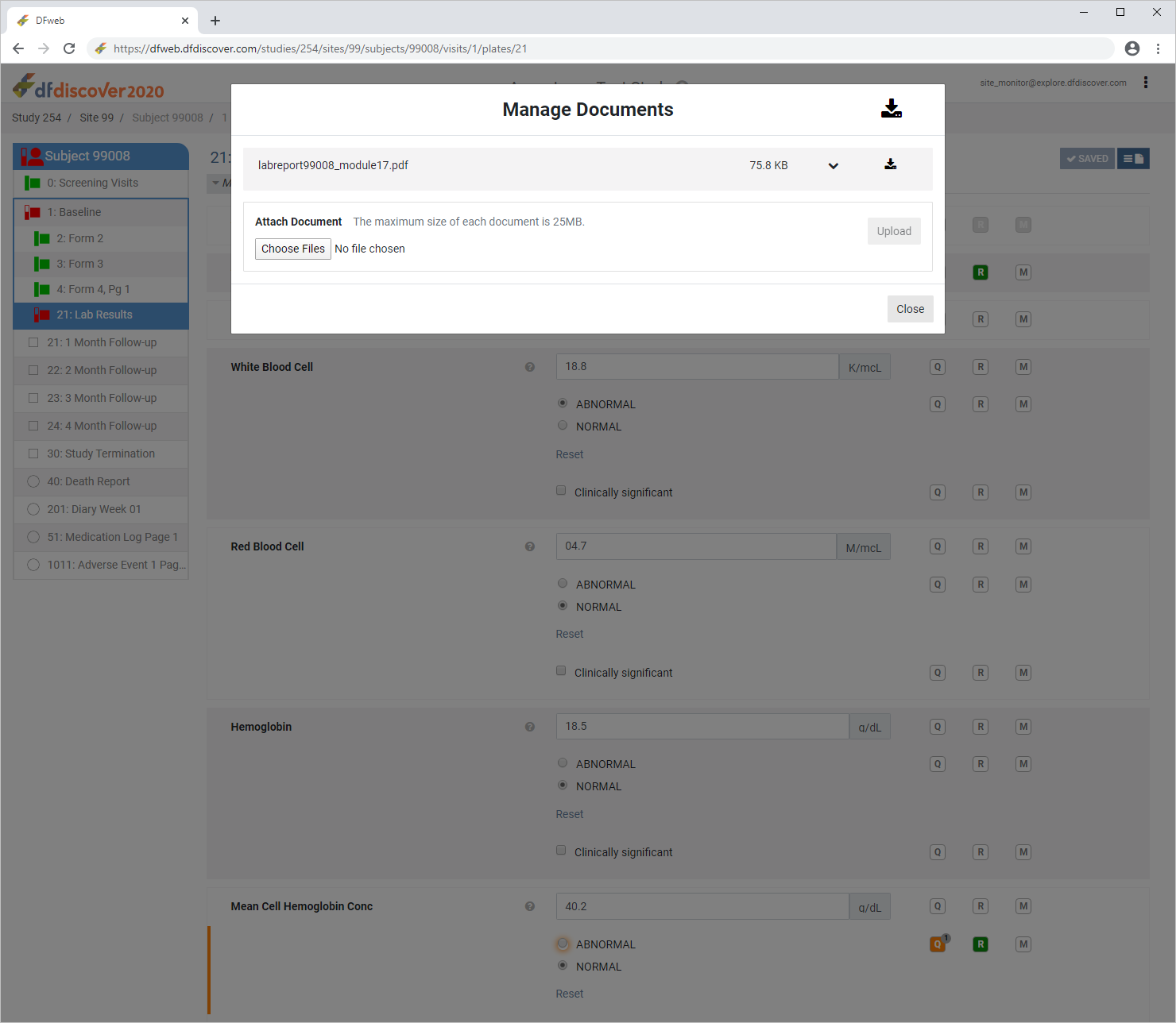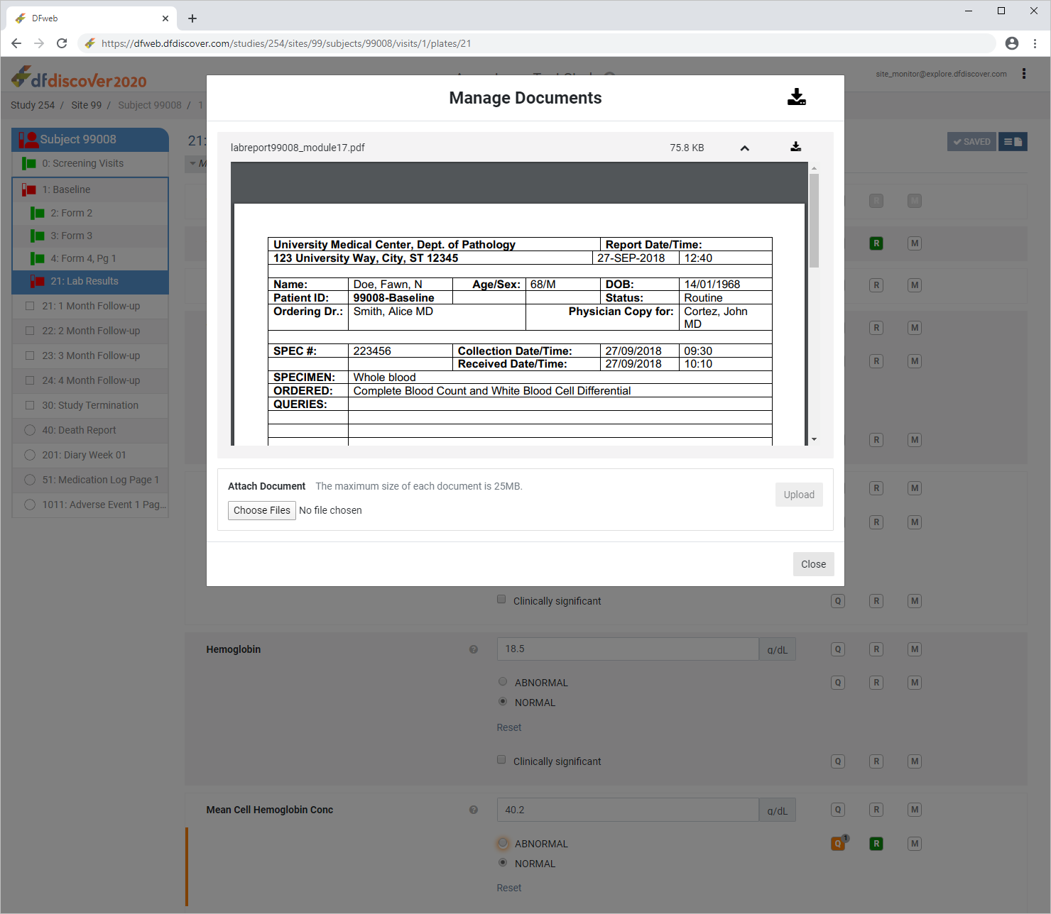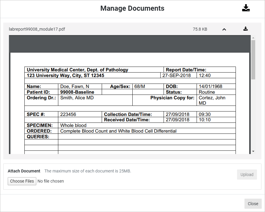 Click , select the previously saved labresults99008_module17.pdf (Refer to Step 2). Click > to upload the document.