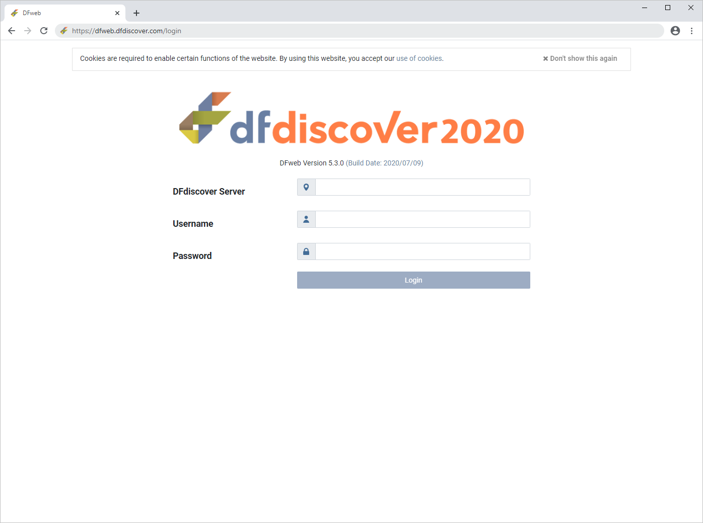 In the DFweb login dialog, enter the DFdiscover Server name that has been provided by your administrator.