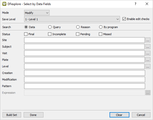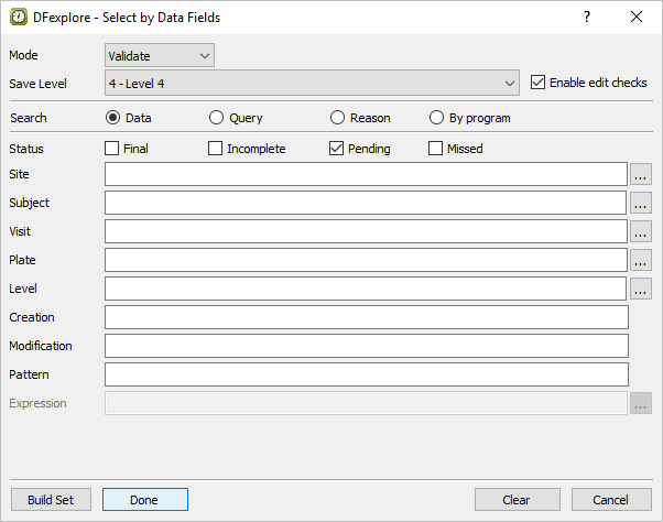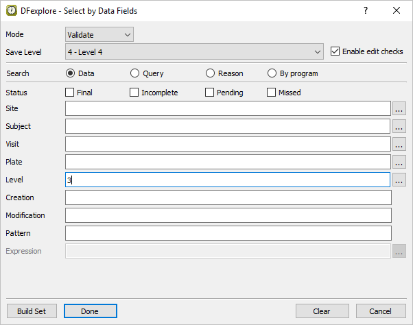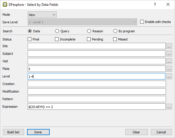 Do the following to build an expression that searches for the occurrence of adverse events: In the Expression Editor, select 25:AEYN from Fields. From the Symbols list choose == equals. From the Codes list choose 2 Yes. Click to add the expression to the Expression field in the Select by Data Fields retrieval dialog.