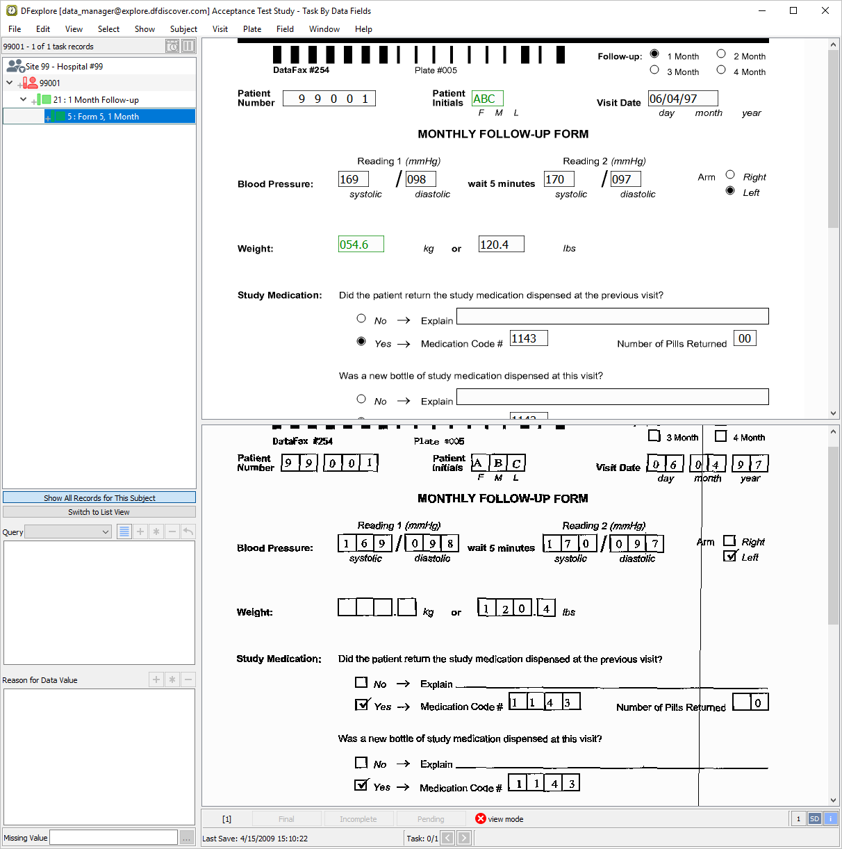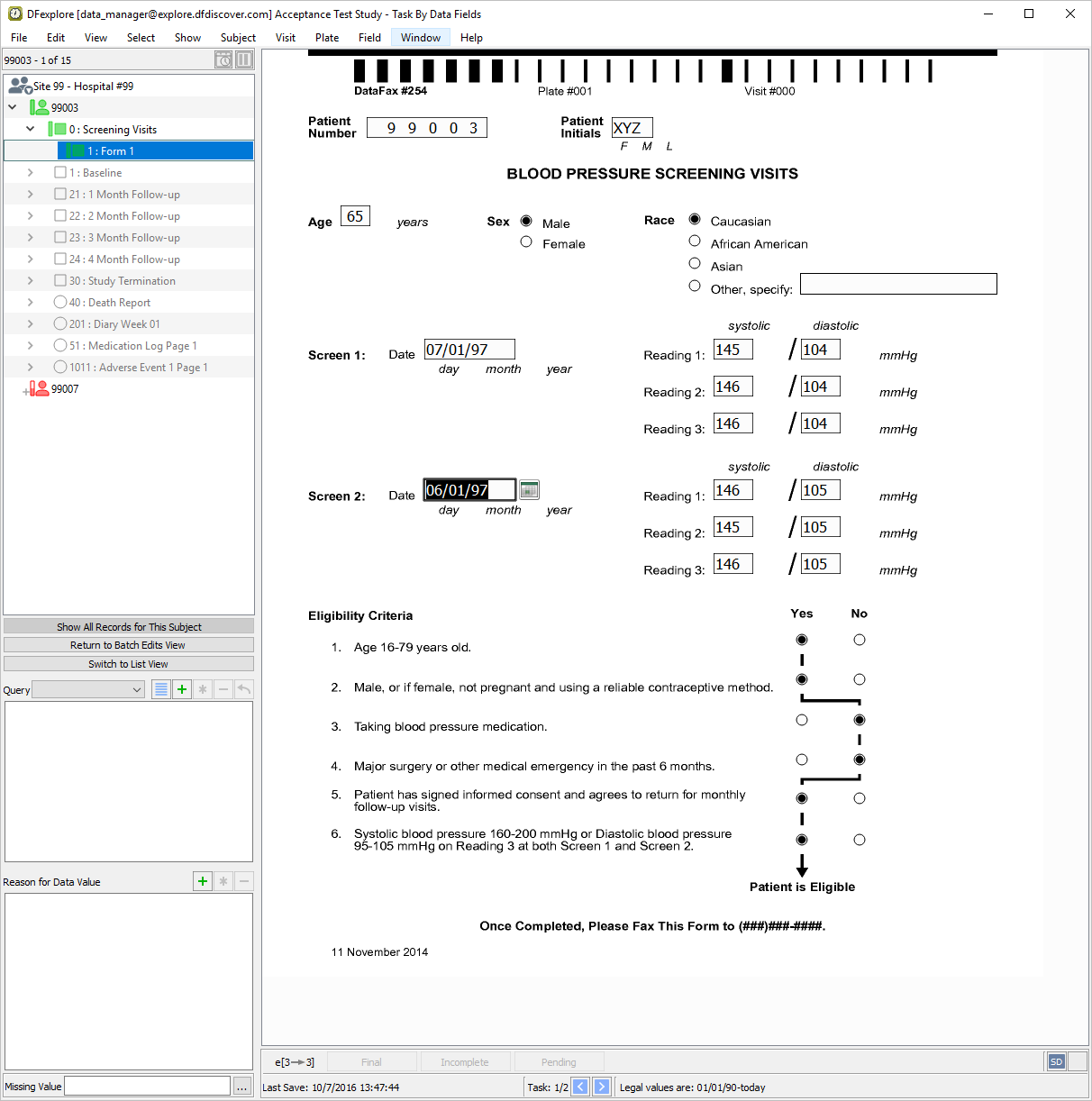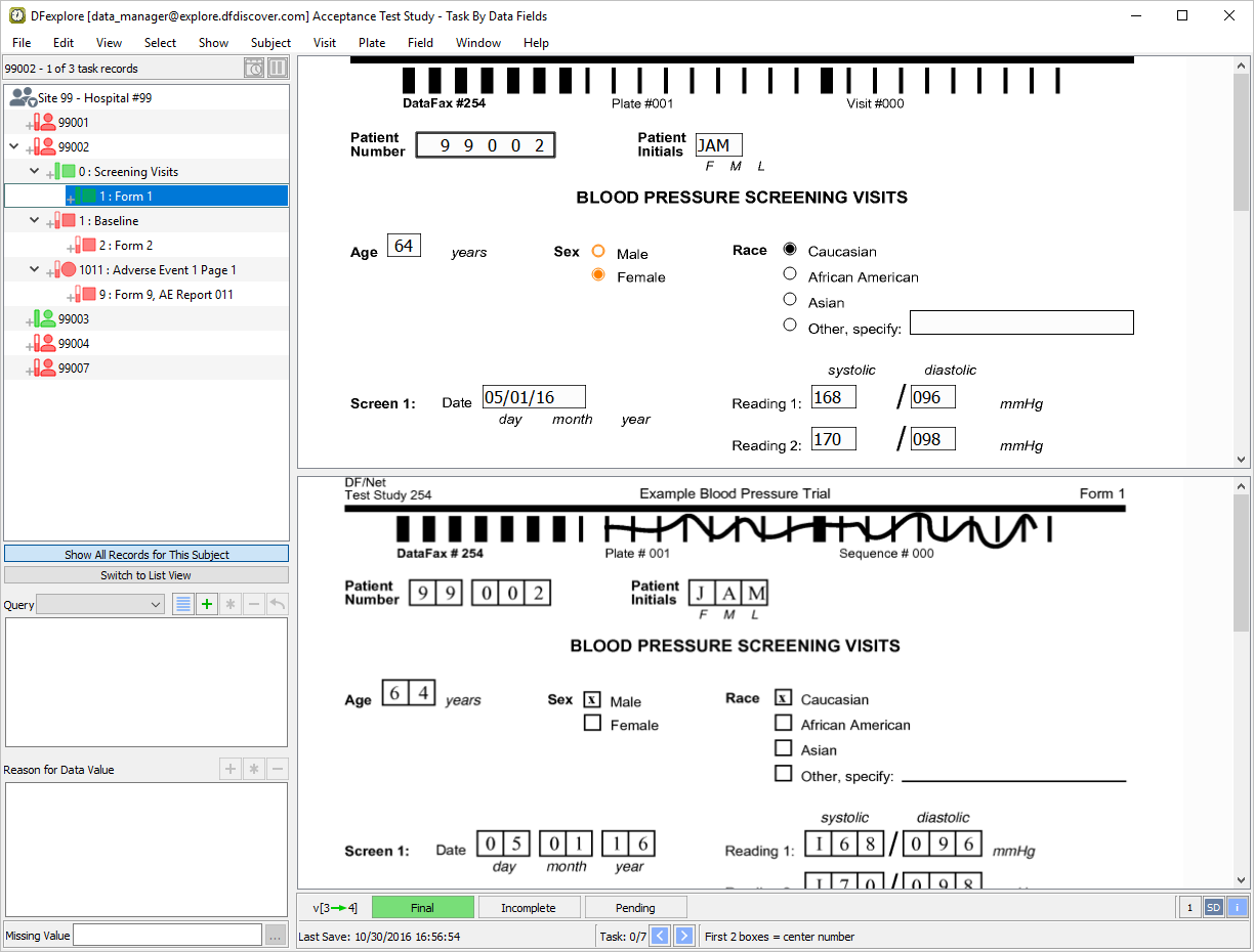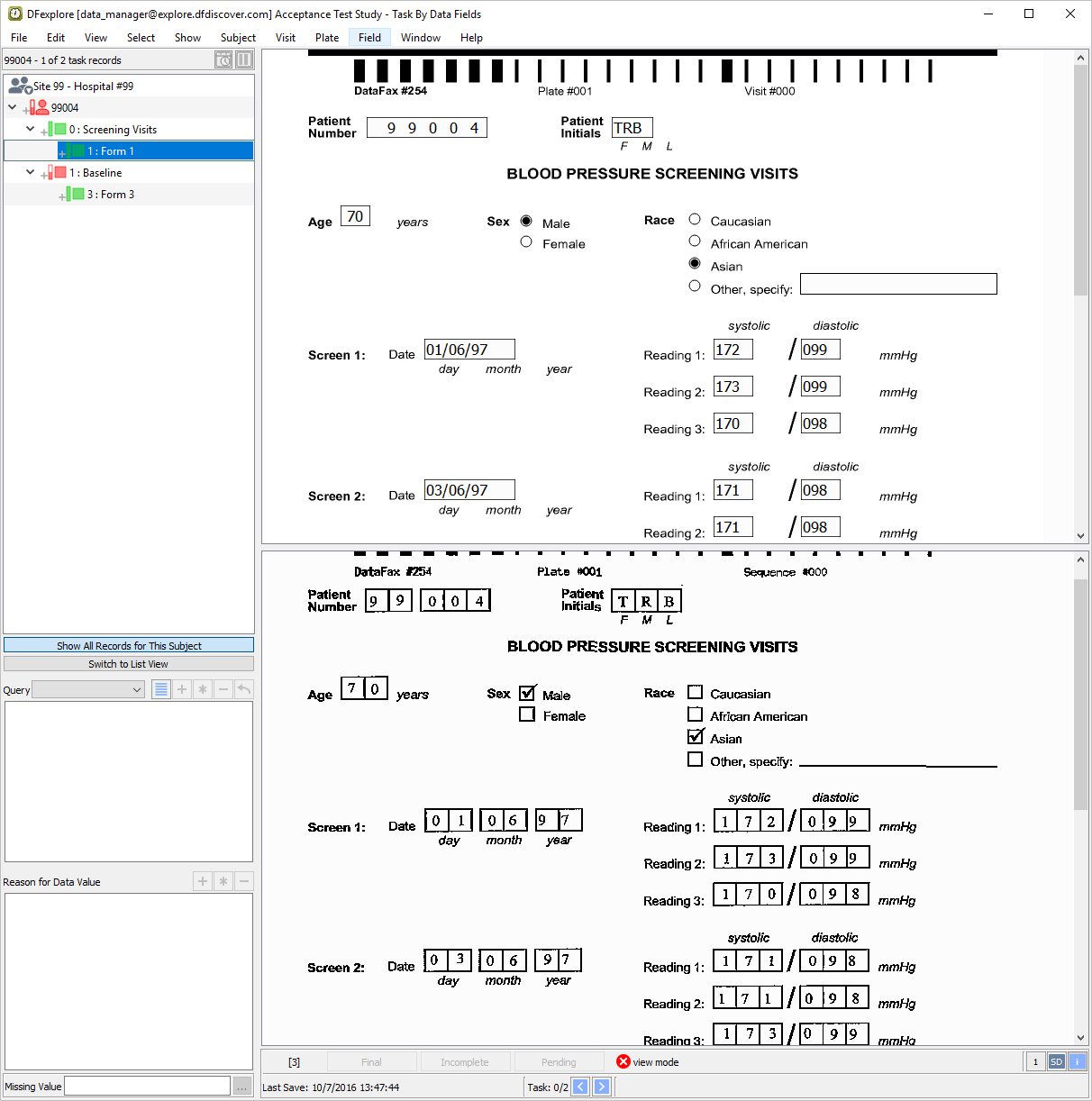 Double-click Subject 99007 entry in the record list to open task records for this subject. Press Tab to advance through the fields until Screen 1, Reading 1 systolic blood pressure becomes the current field.