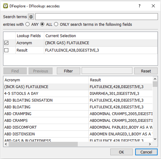 Press Tab to exit the Description field. Upon leaving the field, the DrugLookup edit check is executed and DFlookup:aecodes dialog appears. Click .