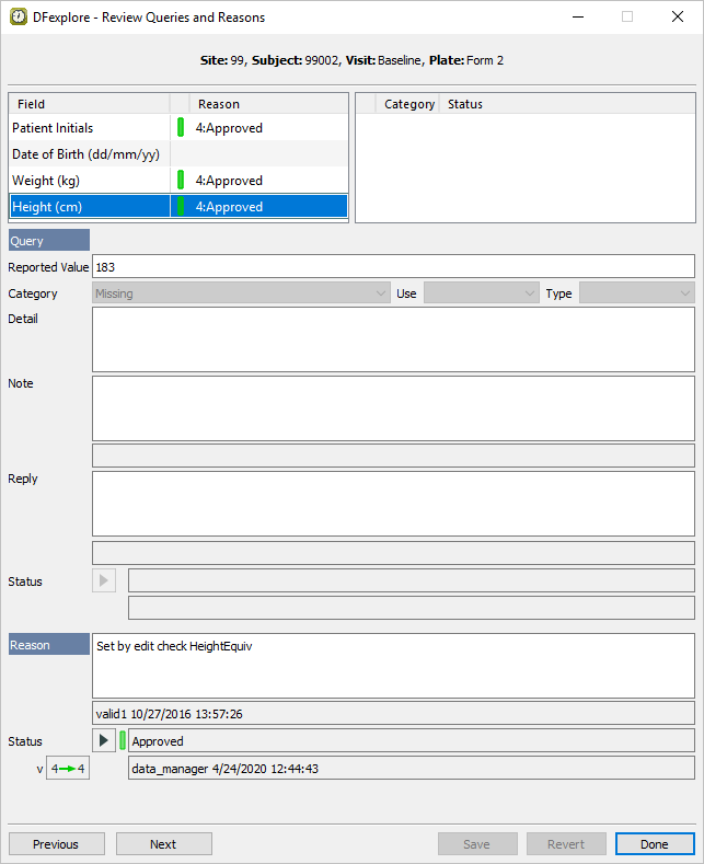 Select the 4th Reason entry Height (cm). Confirm that the Status is set to Approved and