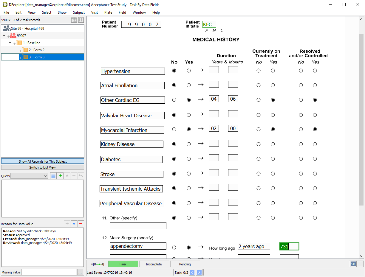 Select Subject 99007 > 1 : Baseline > 3: Form 3 from the record list and click anywhere on the page background to make it the active page. Beginning with the Patient Number field, press Tab to advance through the fields until the first Major Surgery text field is the current field. Enter all Major Surgery information as it appears in the following image. Press Tab to exit the last data field to make the save buttons active.