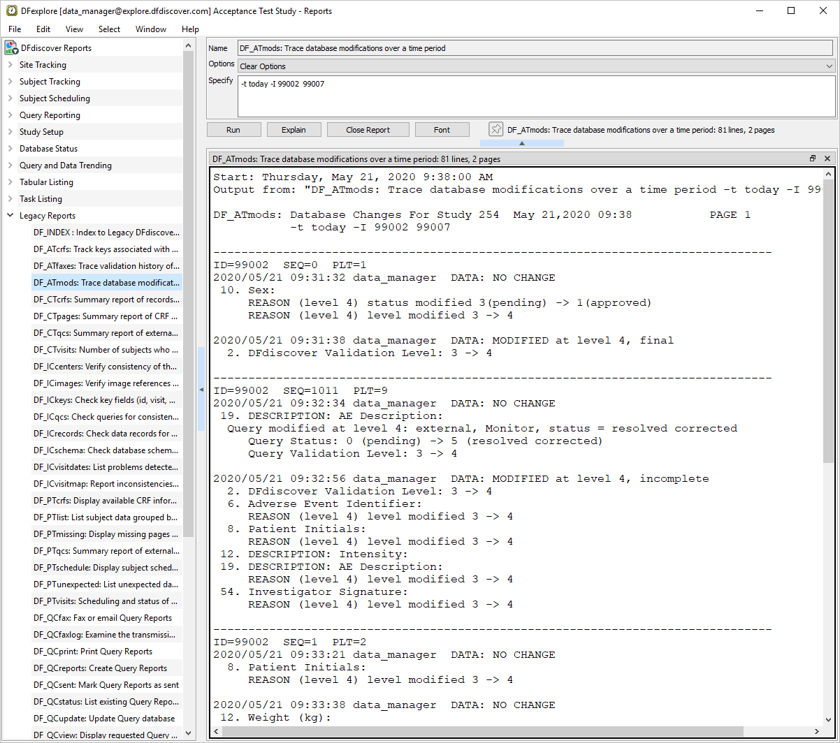 Click the Legacy Reports section and choose report DF_ATmods from the list of reports. To review all data modifications made to Subject 99002 and 99007. Enter -t today -I 99002 99007 in the Specify field.