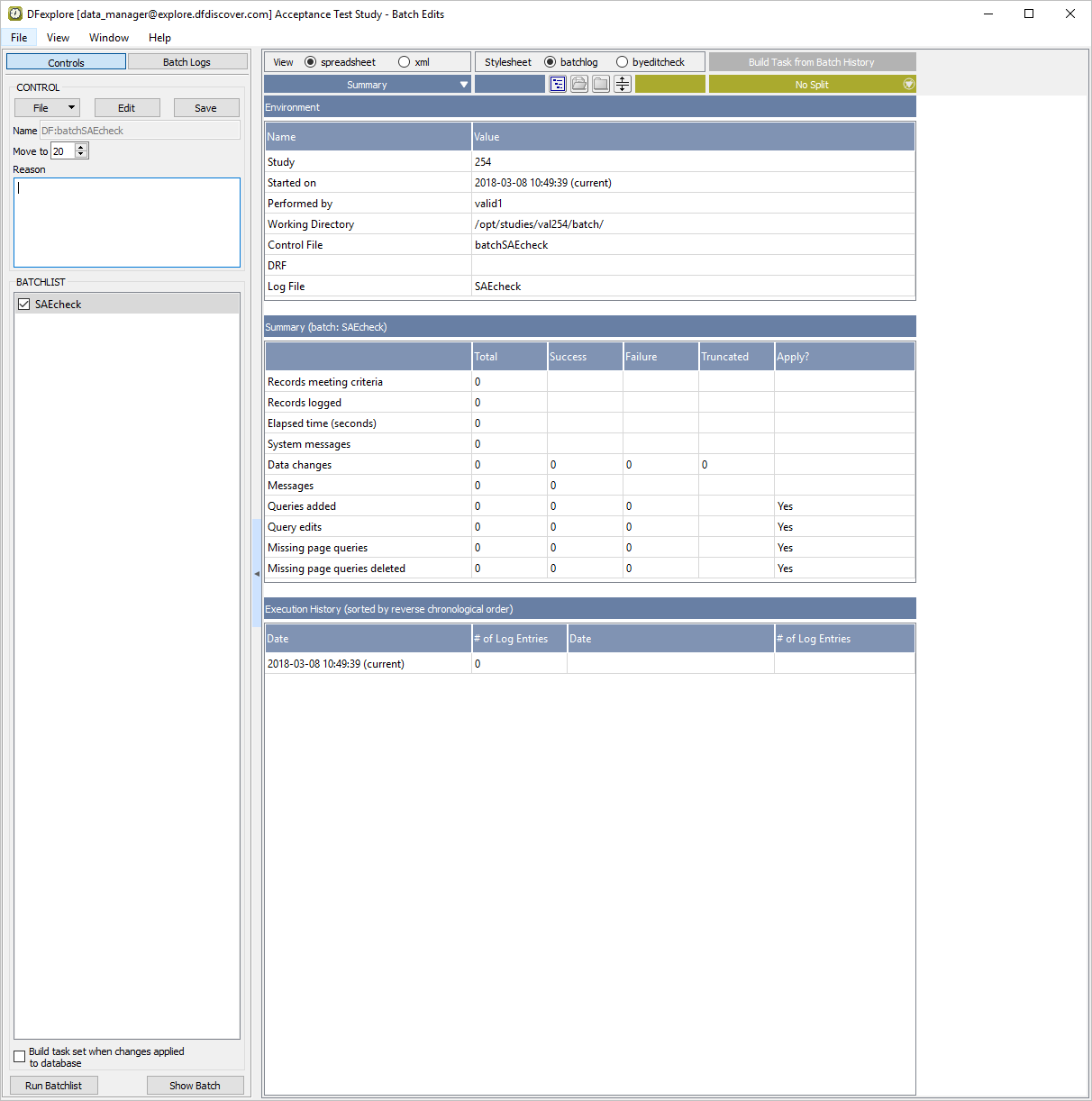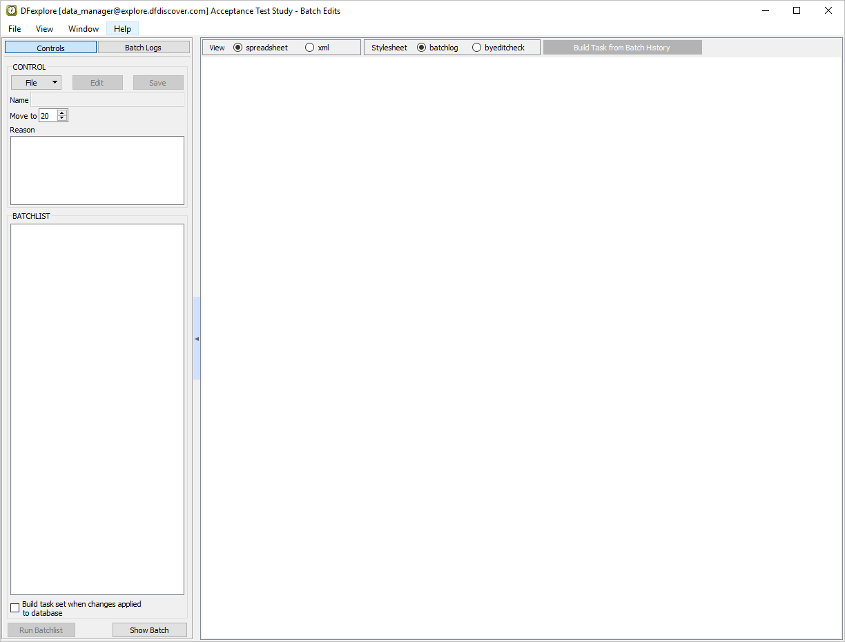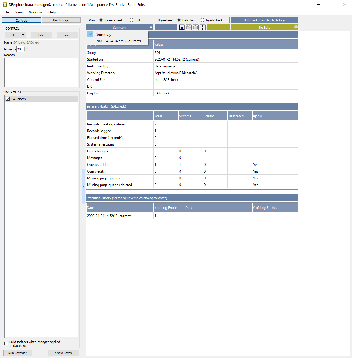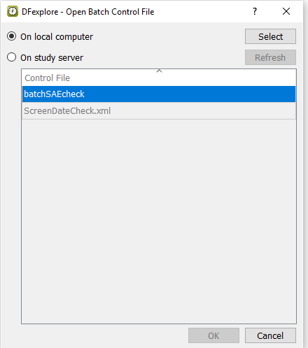 In the Open Batch Control File dialog, select (enable) the On study server option to display a list of available control files that are located on the study server for the 254 Acceptance Test Study. Choose batchSAEcheck from the list and click to load the control file.