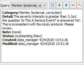Click the second query with the Category type Monitor and a status of 4: External - Resolved corrected. Click to close the dialog.