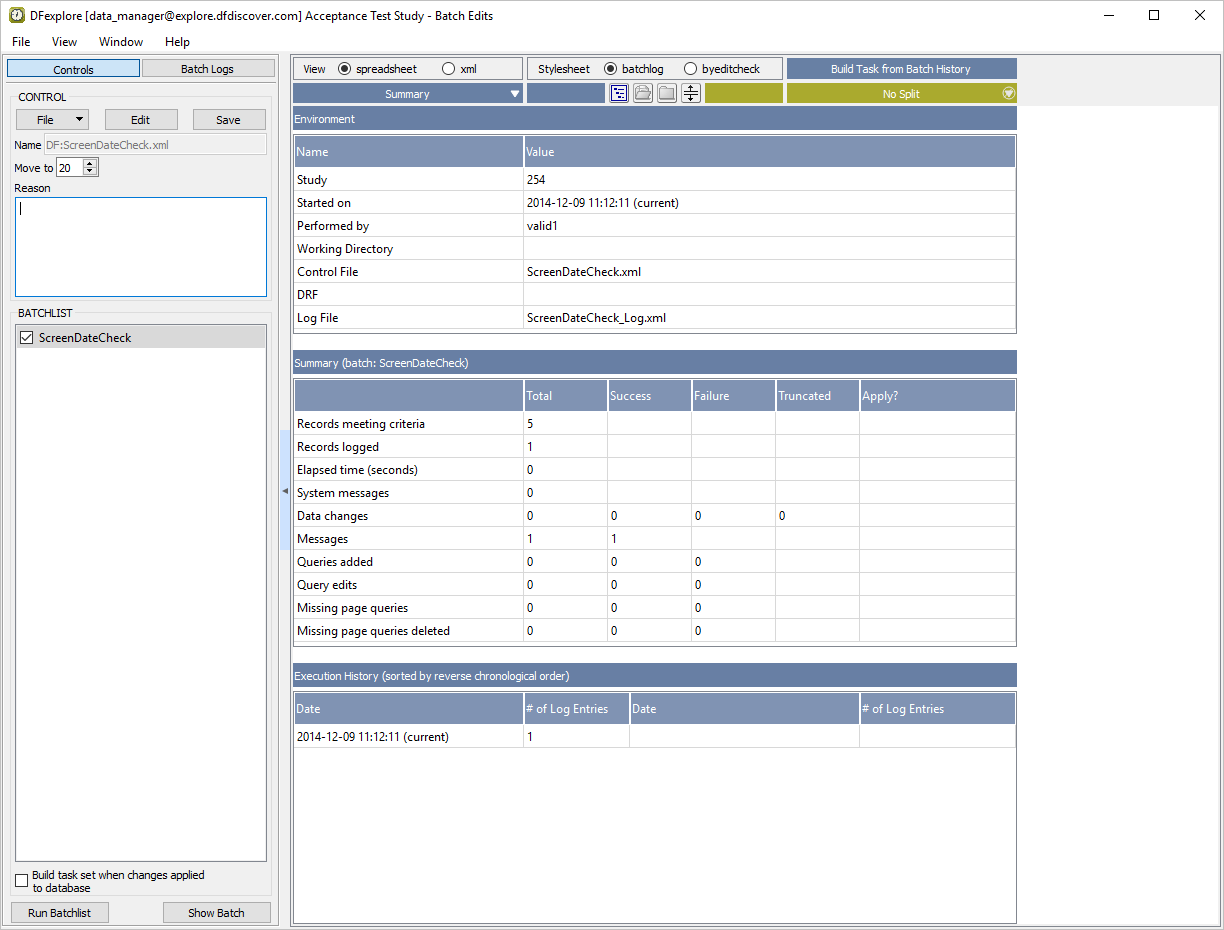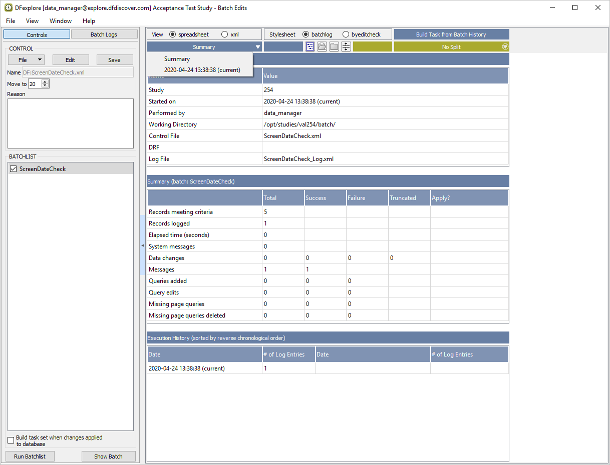In the Open Batch Control File dialog, select (enable) the On study server option to display a list of available control files that are located on the study server for the 254 Acceptance Test Study. Choose ScreenDateCheck.xml from the list and click to load the control file.