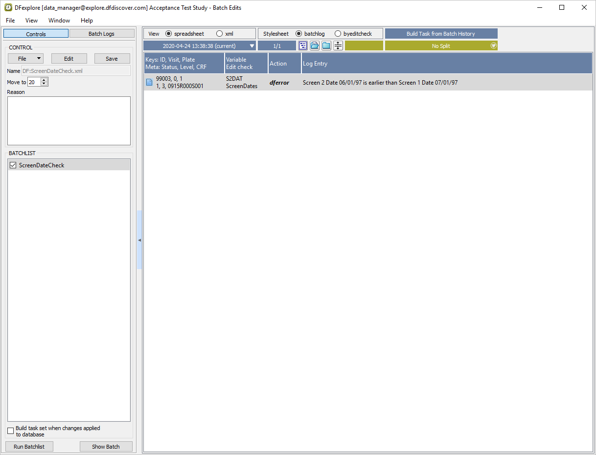 The ScreenDateCheck.xml control file executes the edit check |