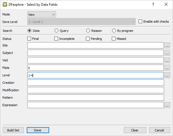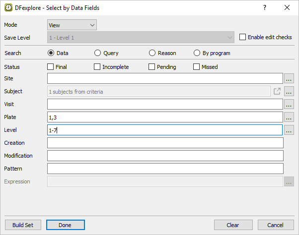 Still in Data View, determine which subjects have had adverse events. Do this by selecting > to open the Select by Data Fields window. In the dialog, set: