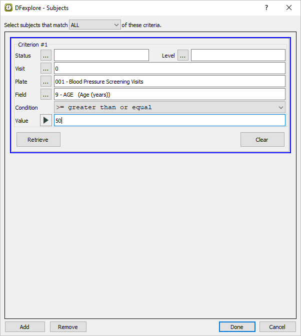 next to Field to get a listing of all fields defined on the selected plate 1. Double-click AGE to populate the Field specification. Using the Condition drop-down menu, choose >= greater than or equal to assign a retrieval Condition. Finally, specify 50 in Value.