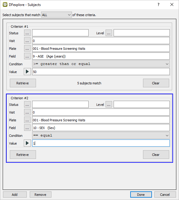 Click to retrieve the number of subjects that match the specified Sex criteria. Click to add a new criteria block in preparation for the specification of the 3rd retrieval criteria (history of diabetes).