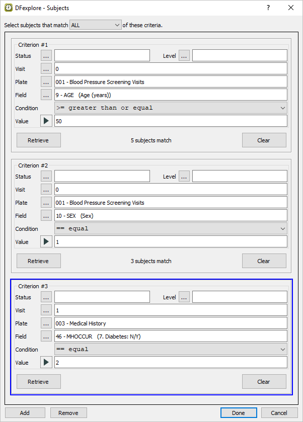Click to retrieve the number of subjects that match the specified Diabetes history criteria. Click to find the subjects that match ALL three of the criteria specifications and close the Subject Criteria dialog.