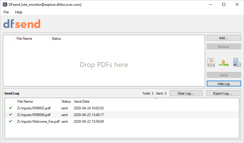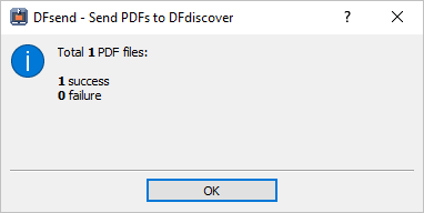 In the resulting Send PDFs to DFdiscover dialog, confirm 1 success and 0 failure are shown. Click .