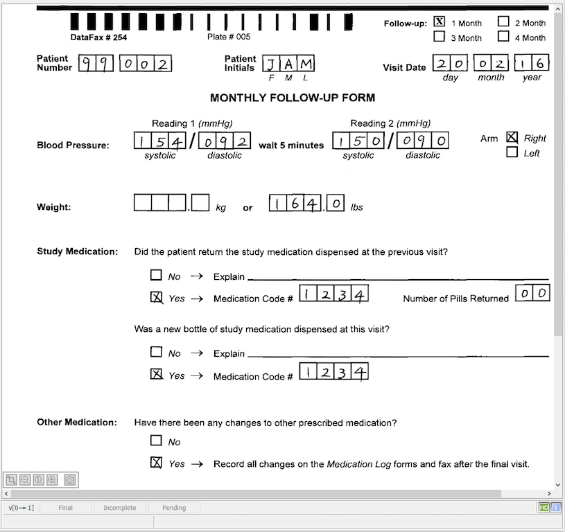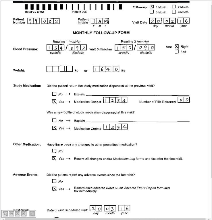 Enter the Sex and Race fields as they appear on the CRF image. Press Tab to advance to the Screen 1 date field and enter its value 05/01/16 followed by all blood pressure readings for Screen 1 date.