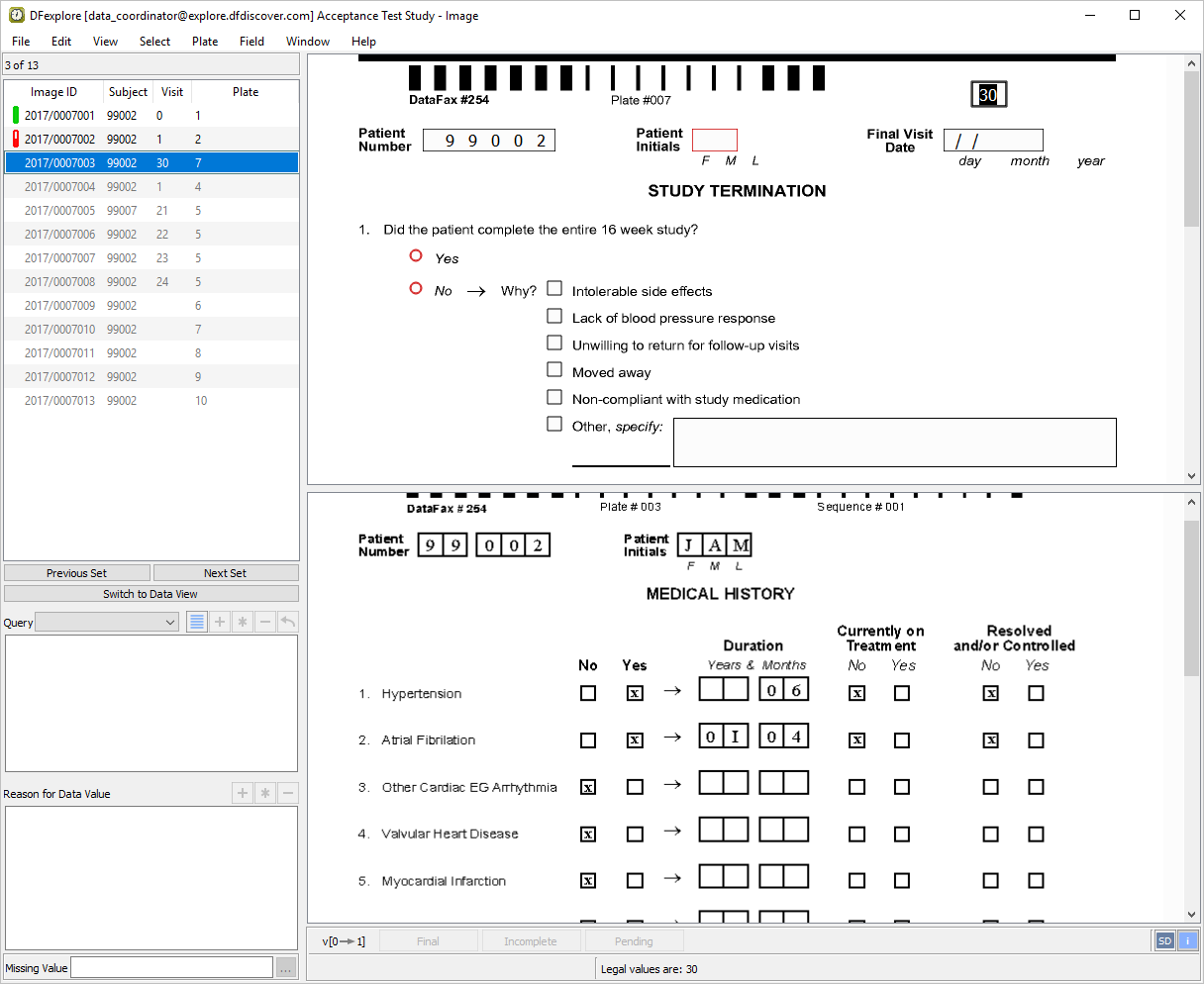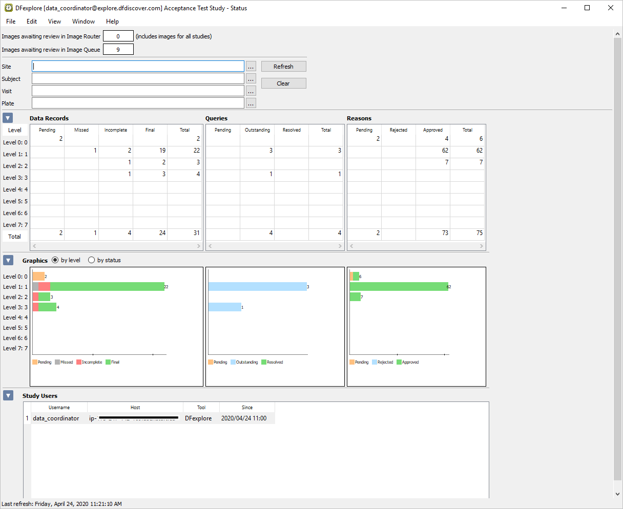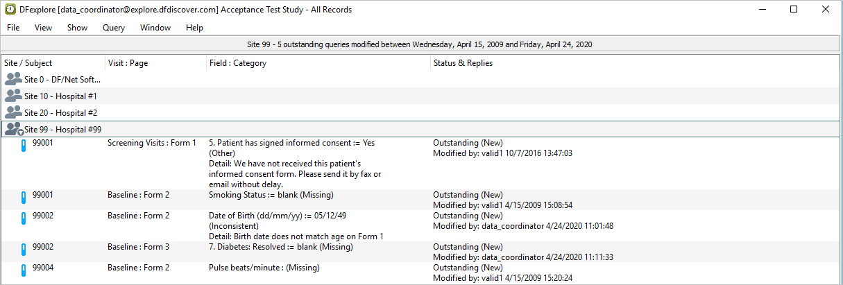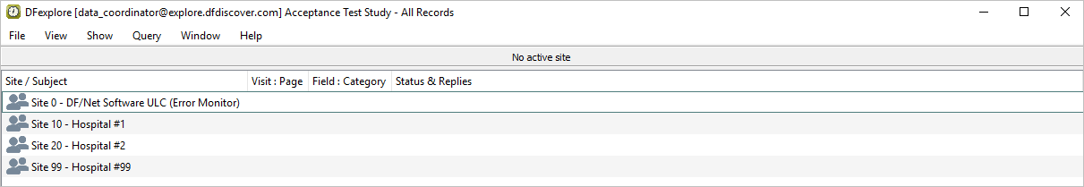 Start DFexplore and login as data_coordinator and choose 254 Acceptance Test Study as described in Section 1.7, “How to start DFexplore”.