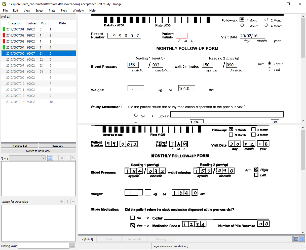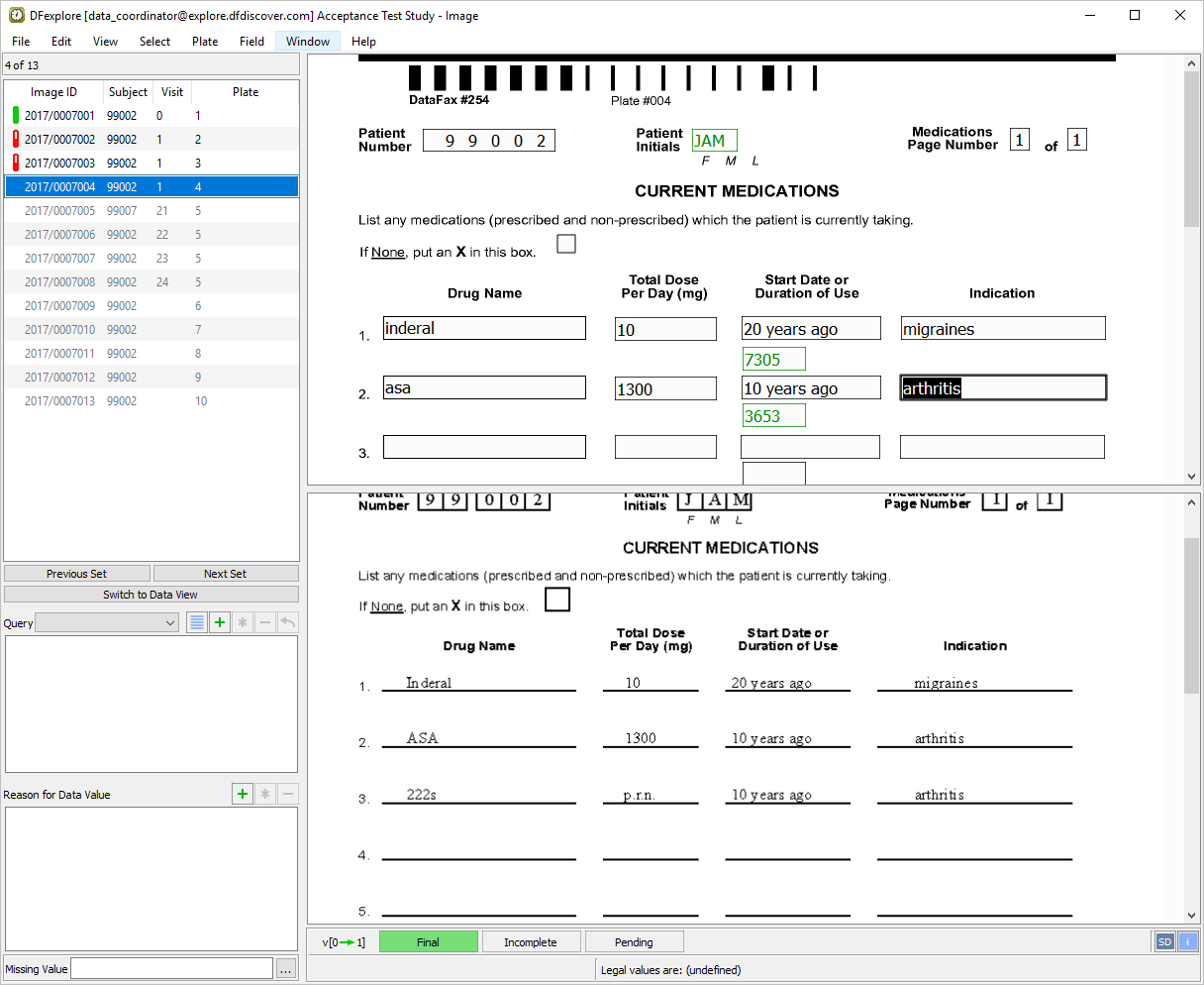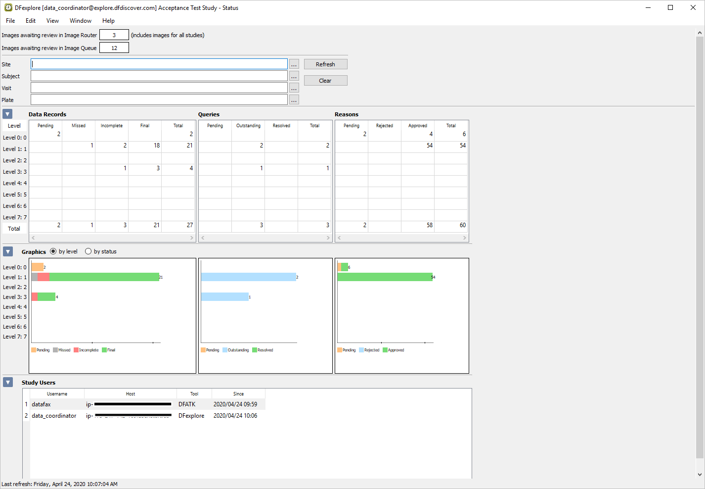 Start DFexplore and login as data_coordinator and choose 254 Acceptance Test Study as described in Section 1.7, “How to start DFexplore”.