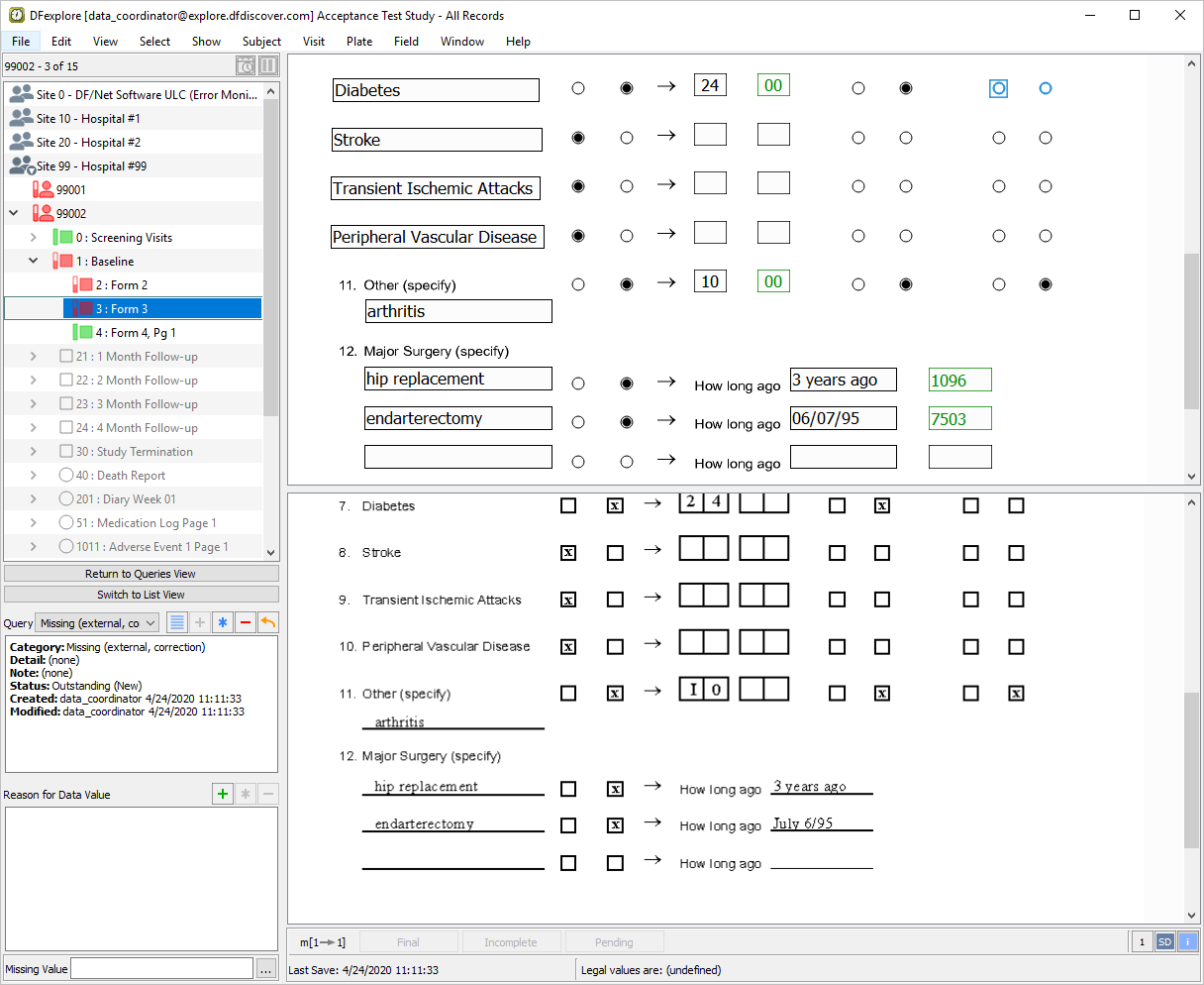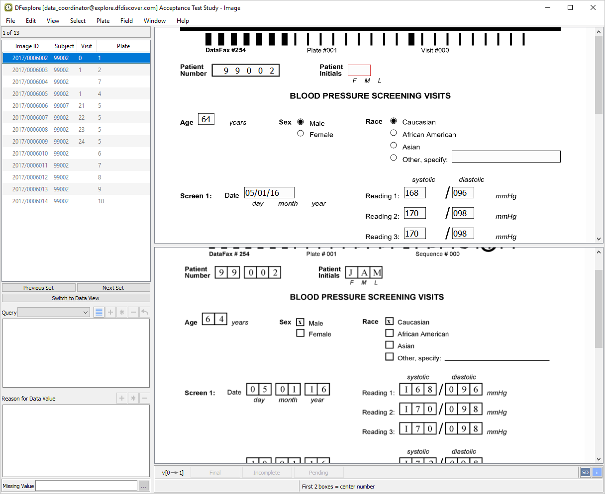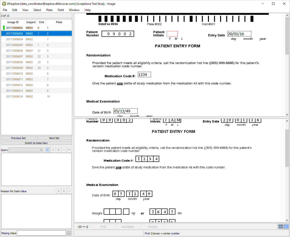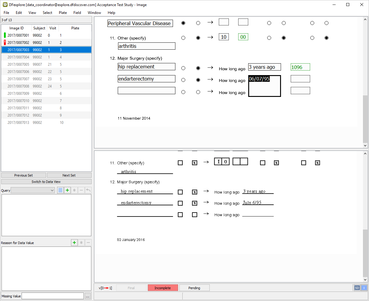 Step 5 to Step 12 test specific data fields. Any field that has not been entered (by you or the DFdiscover ICR) is now completed by entering the values as they appear on the CRF image. After entering the last data field, press Tab off the field to make the save buttons at the bottom of the data entry window active.