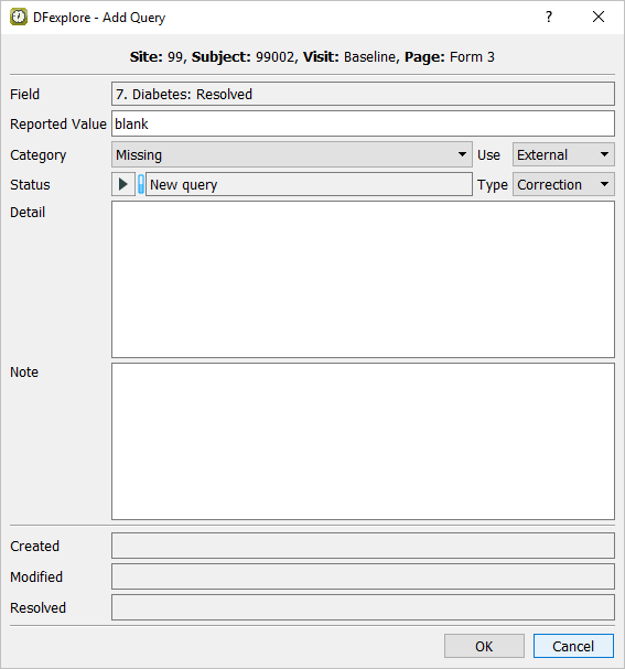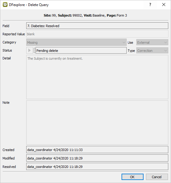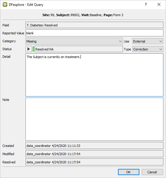 Locate the query for Subject 99002, Baseline : Form 3. This is the query that was added to the field 7. Diabetes, Resolved and/or Controlled in Section 8.10, “Enter Plate 3 (Form 3) for Subject 99002.”. Double-click the query to be taken directly to the page and queried field.
