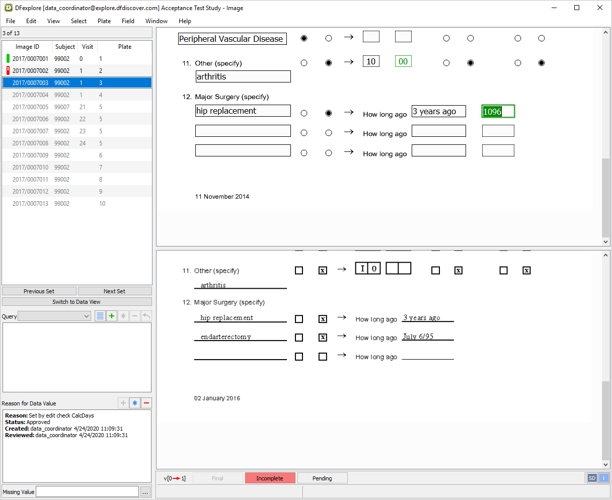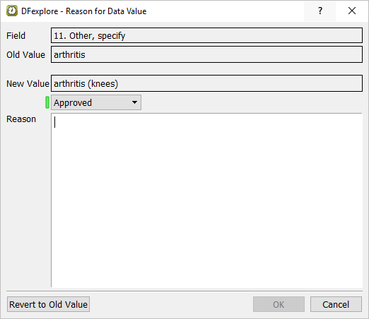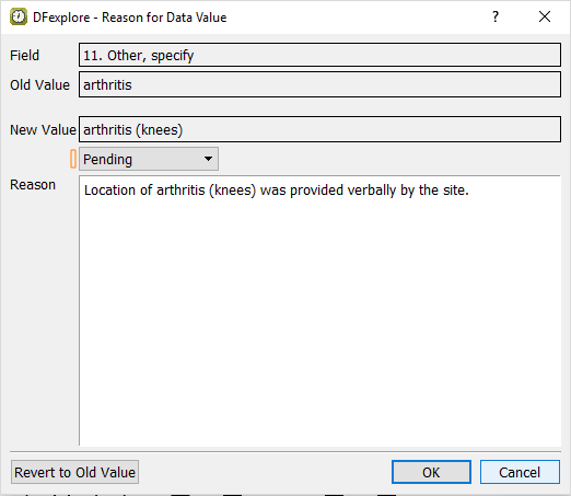 In the Reason for Data Value dialog, confirm that the Old Value and New Value fields display the data values shown. Choose Pending from the status list to change the reason's Status to Pending. Enter the text Location of arthritis (knees) was provided verbally by the site. in the Reason field. Click to close the dialog and save the reason for data change to the database. Press Tab to advance to the next field.