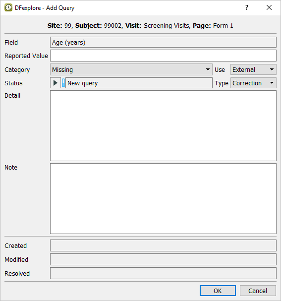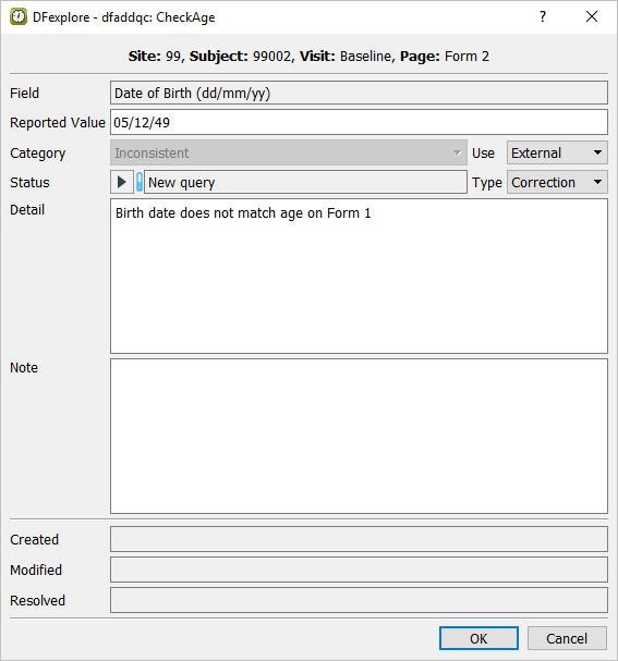 The MissingQC edit check is programmed to pop up a Query note if any of the following fields are left blank: Age, Sex, Screen 1 Date and all Screen 1 blood pressure readings. Test this edit check on the Age field by making this field blank. Press Tab to exit the Age field. When the Add Query window pops up, click to ignore and return to complete the field as per the CRF image, before proceeding to the next field.