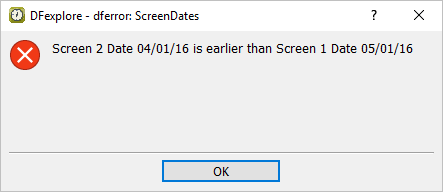 The ScreenDates edit check is executed on exit from the Screen 2 Date field. It checks that the Screen 2 Date follows the Screen 1 Date by at least one day. Enter a Screen 2 Date of 04/01/16, which precedes the Screen 1 Date of 05/01/16, then press Tab to exit the field. After verifying the message in the Add Query confirmation dialog, click .