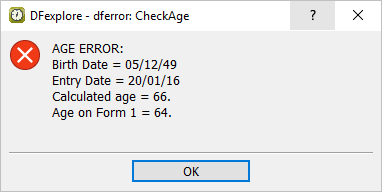 Correctly enter the Entry Date, Medication Code # and Date of Birth values per the CRF image. The CheckAge edit check calculates the Subject's age from the Entry Date and Date of Birth fields, and compares this value with the value entered for Age on Plate 1. If these values disagree, an error message is displayed. Press Tab to exit Date of Birth field to execute the CheckAge edit check.