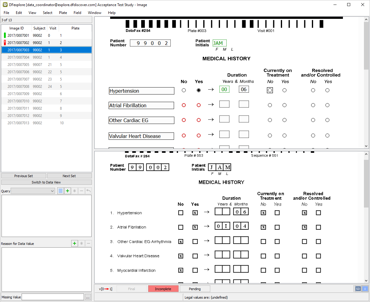 In your normal image entry process, you must always pay careful attention to the accuracy of the ICR data. You will need to do the same here. It is possible that the new pages contain ICR errors that you will need to correct during entry. In particular, it is important that you correct any key fields (visit and/or subject numbers) that may have been misread as these are critical to the identification and storage of the data. Note that the ICR data records on your screen may not match exactly those shown in the examples throughout this module. |