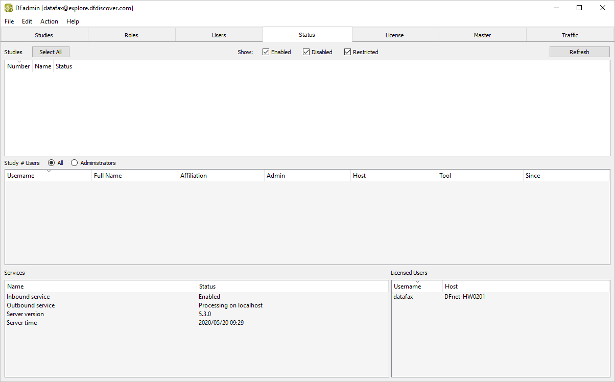 The list of studies defined on your DFdiscover Server will be displayed in the studies list.