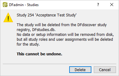 This step is required only if 254 Acceptance Test Study already exists on your DFdiscover server. If it does not currently exist on your DFdiscover server, skip this section and continue with Section 1.4, “Install the Acceptance Test Study. ”. If an earlier version does exist on your server, delete it prior to installation by following these steps. |