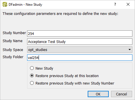 Return to DFadmin, select the Studies tab. Add a definition for 254 Acceptance Test Study. Click and complete the dialog with the following values: