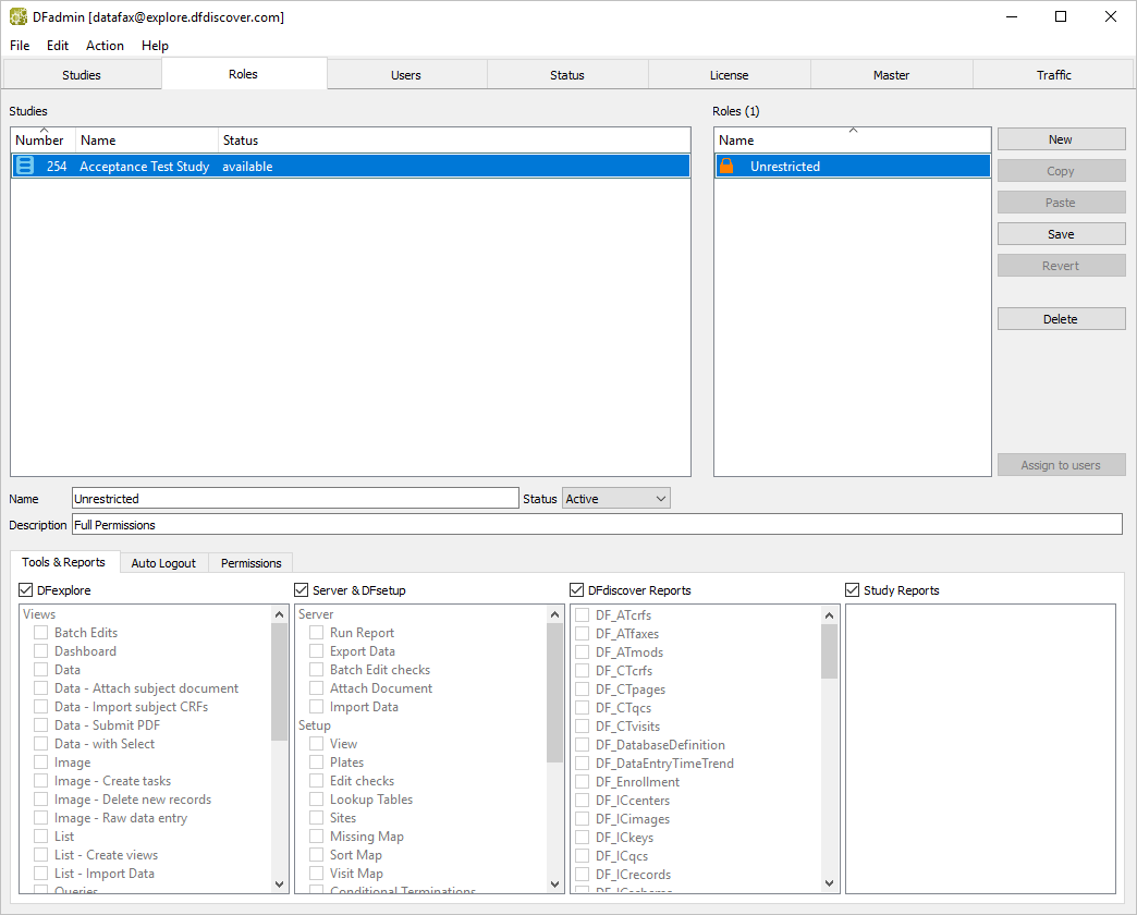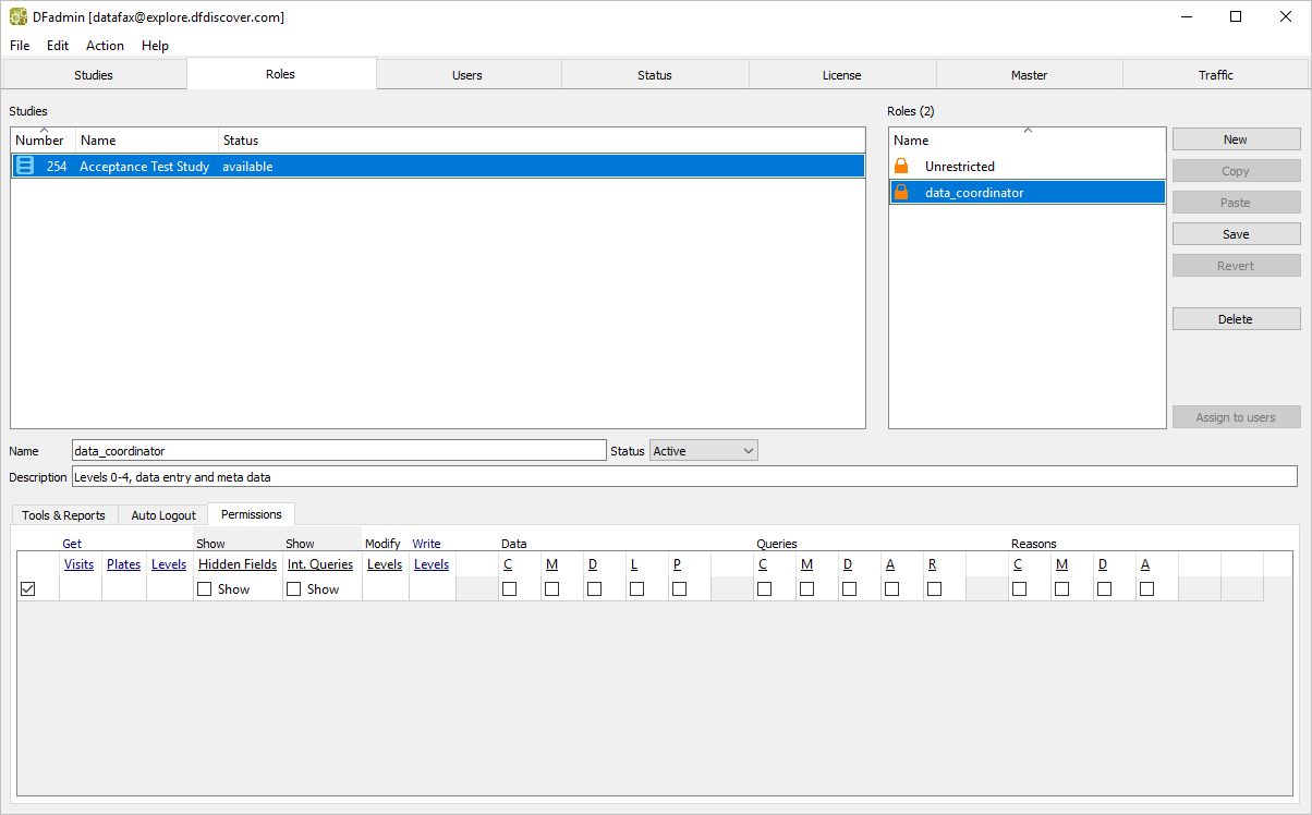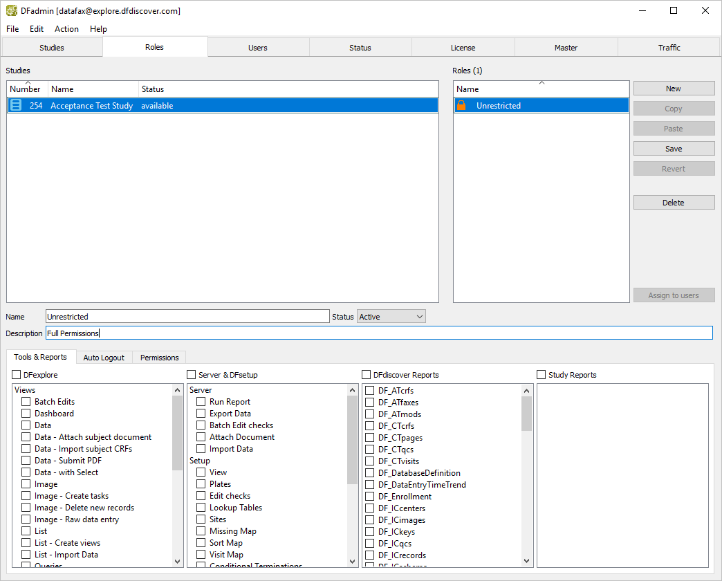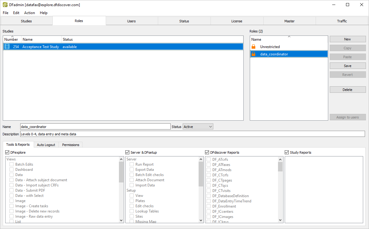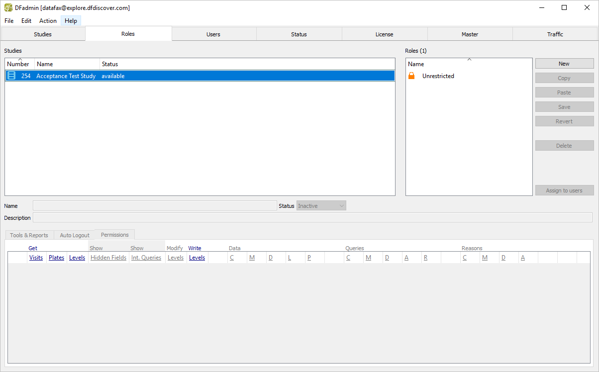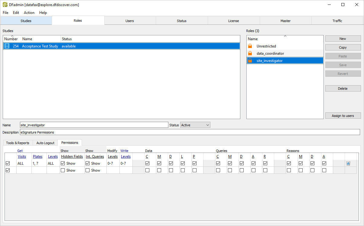 User datafax is already defined on your DFdiscover installation, however, you must grant user datafax a role and permissions to be able to access 254 Acceptance Test Study.