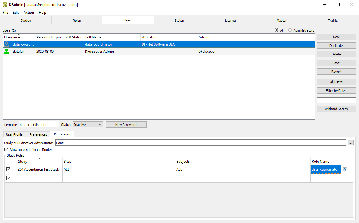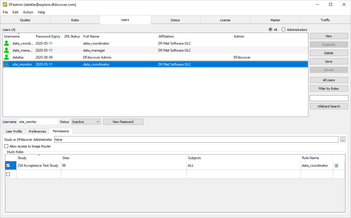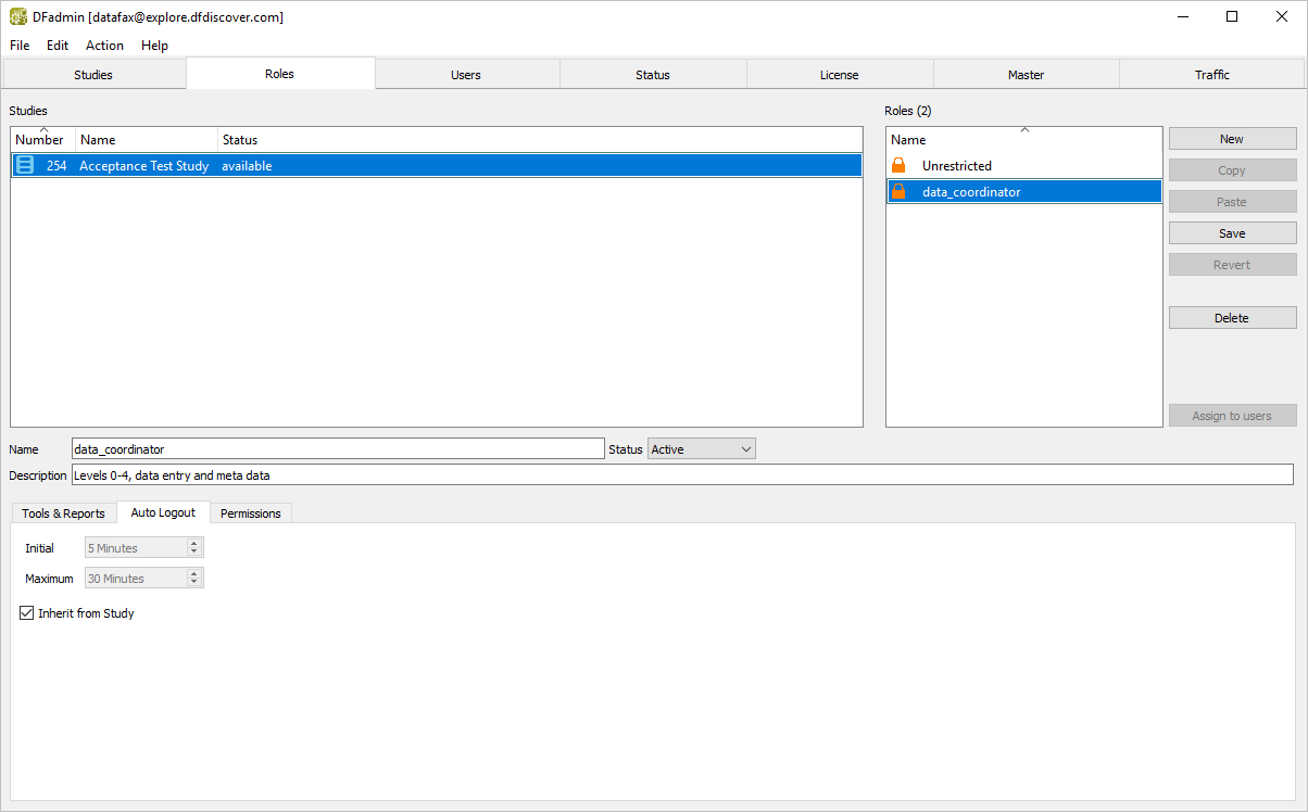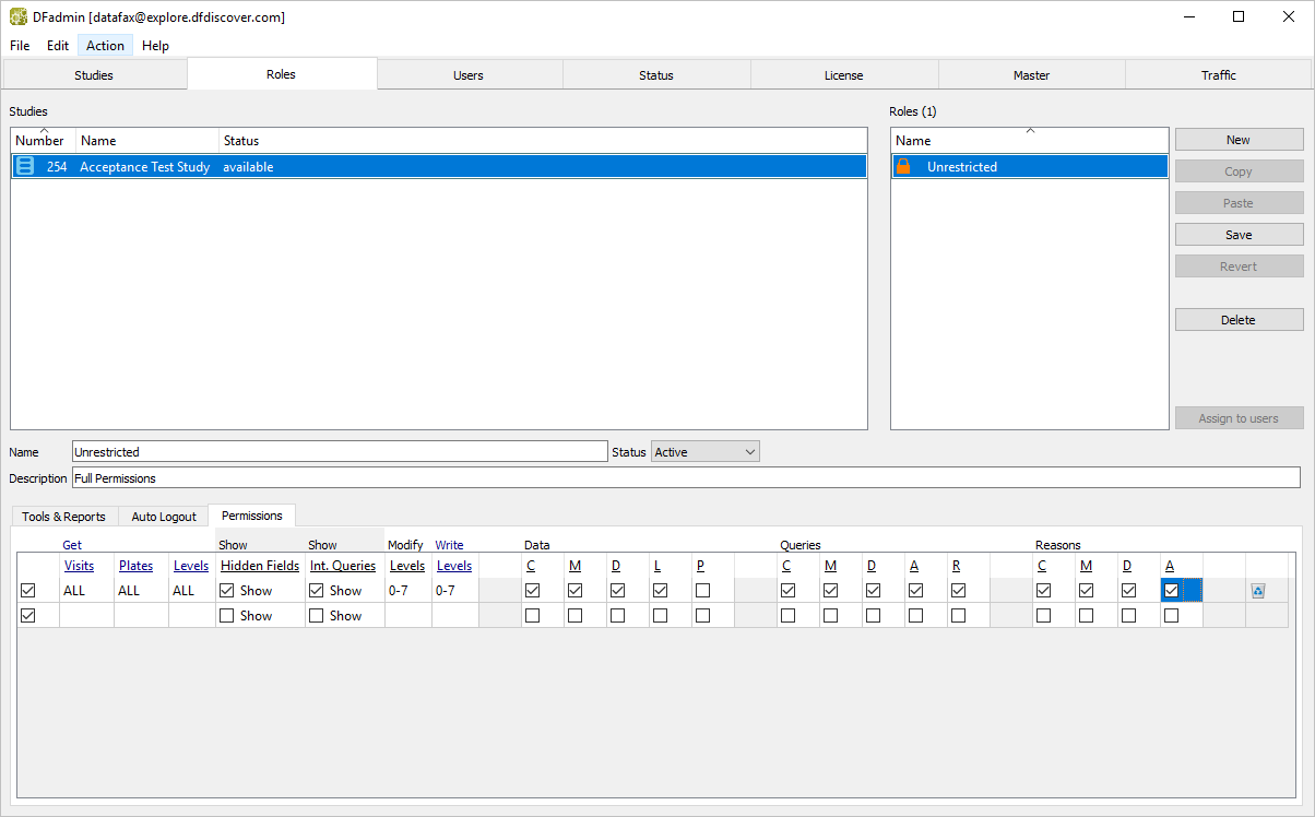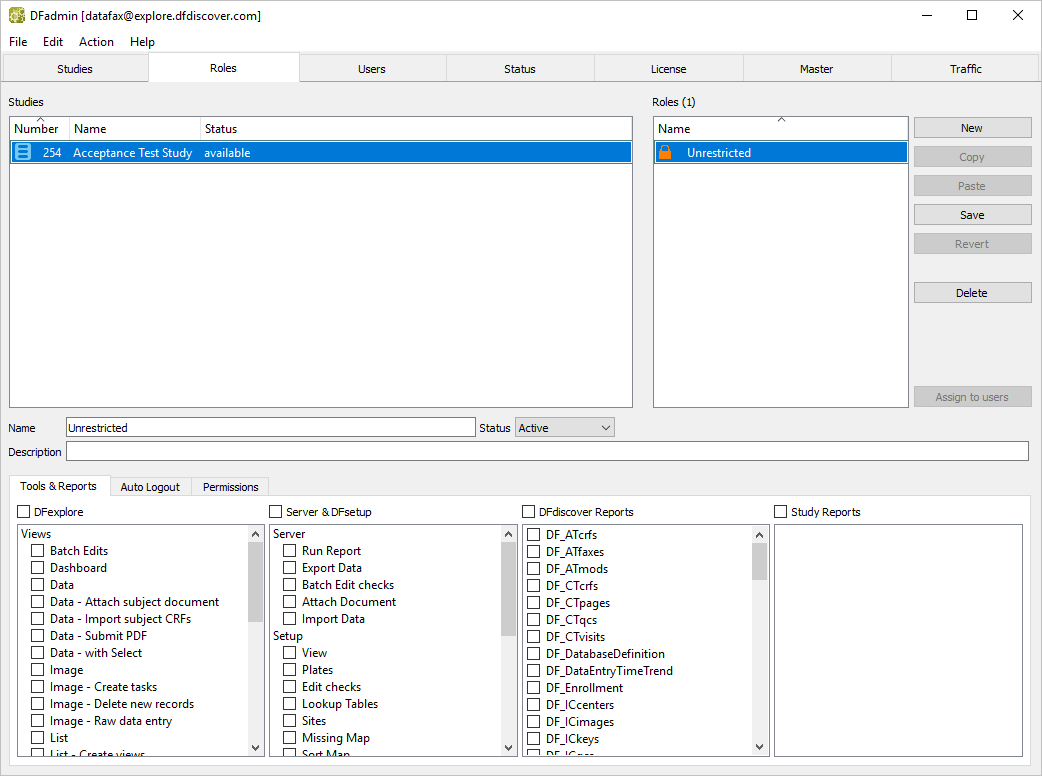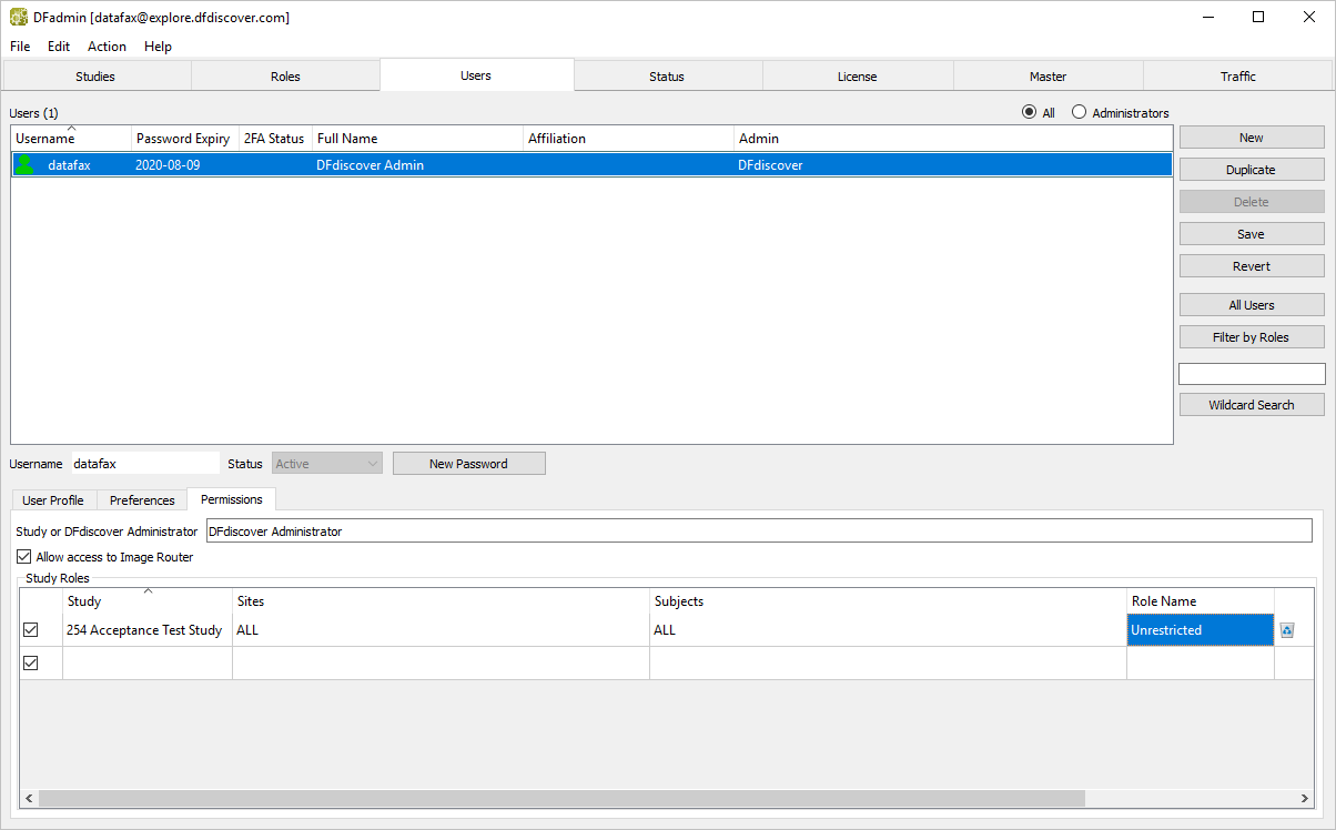 User datafax is already defined on your DFdiscover installation, however, you must grant user datafax a role and permissions to be able to access 254 Acceptance Test Study.