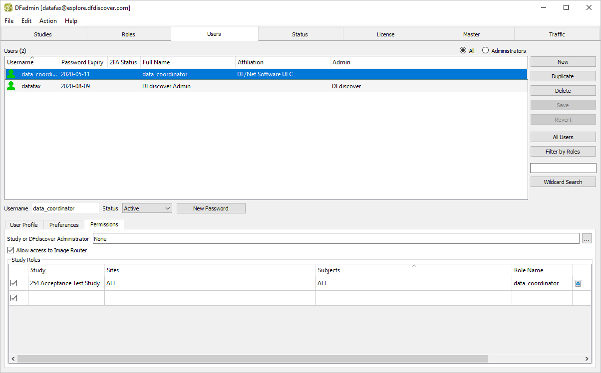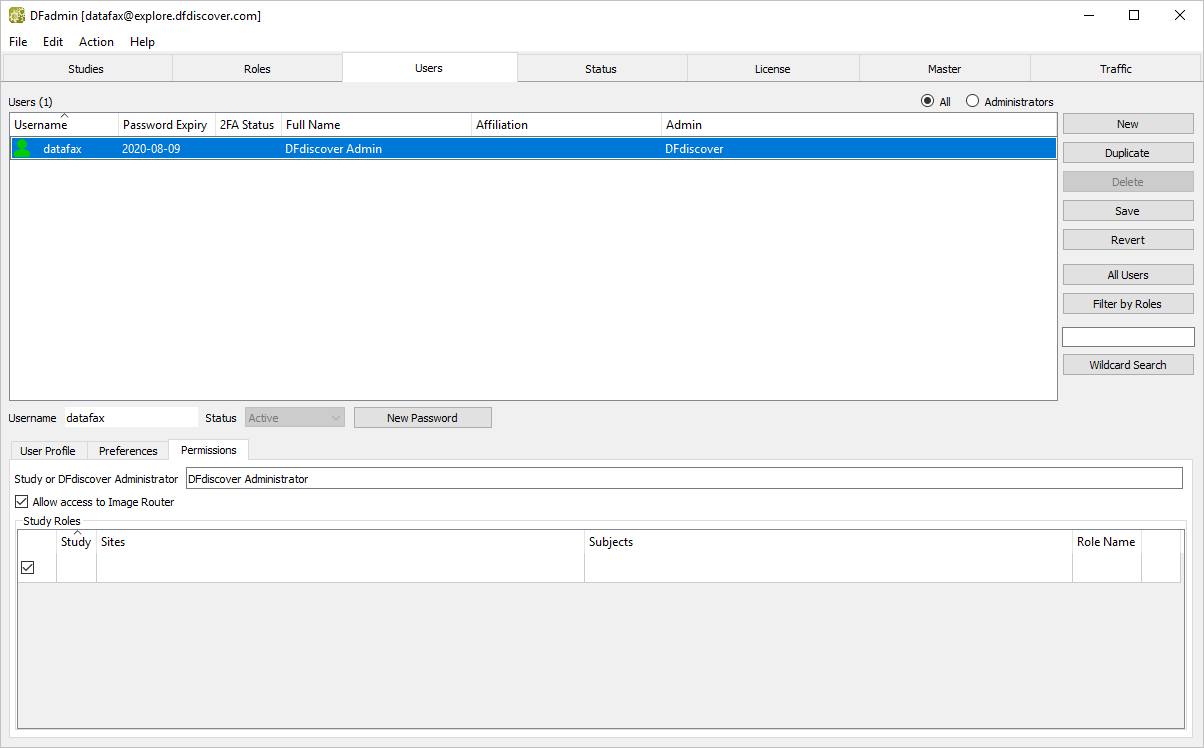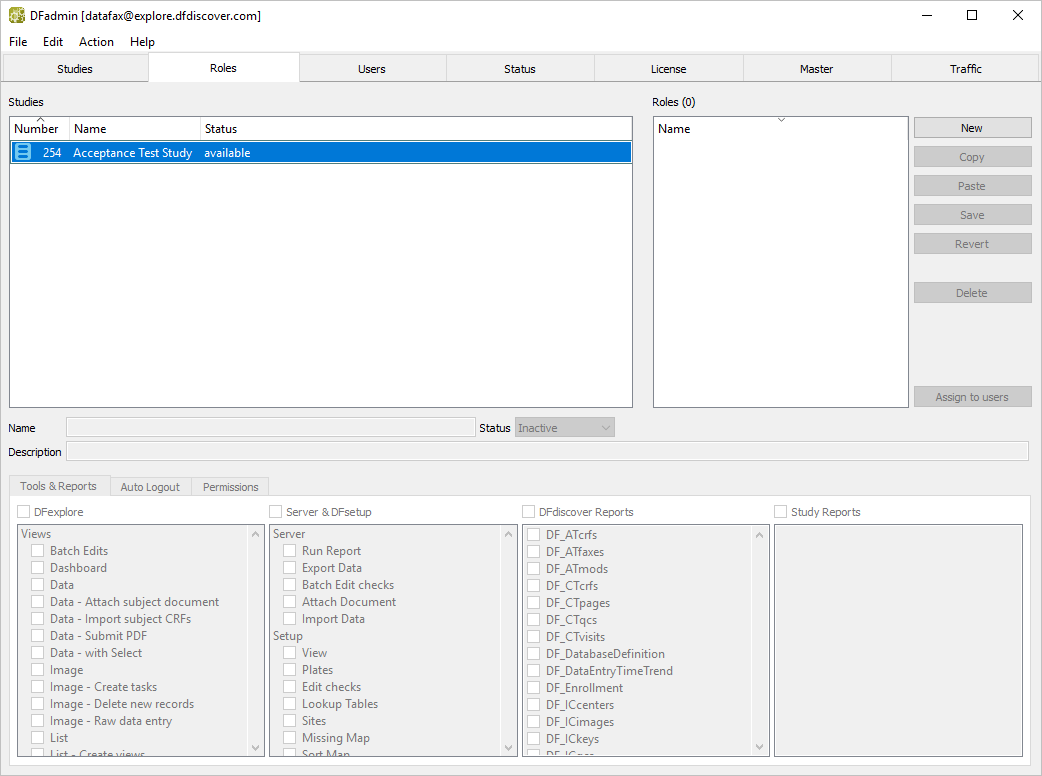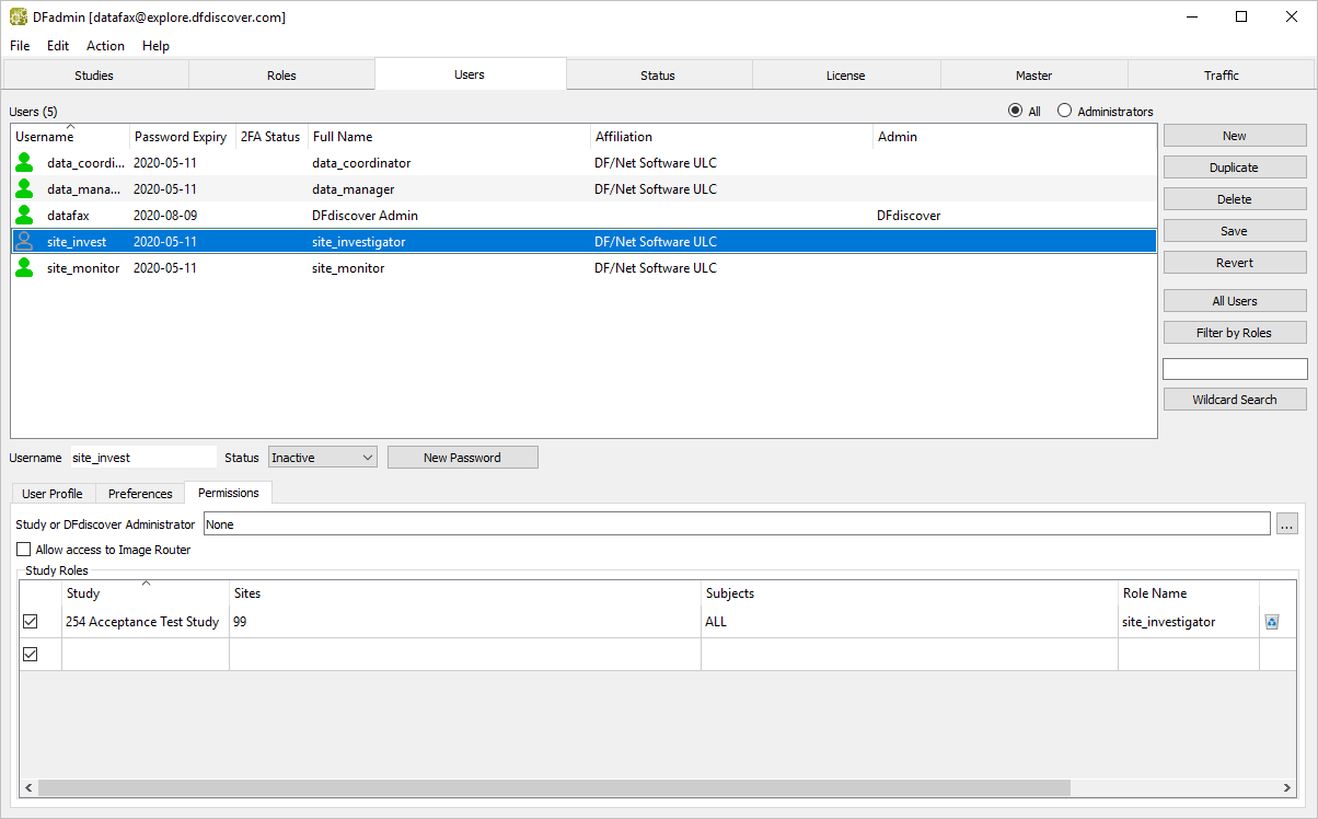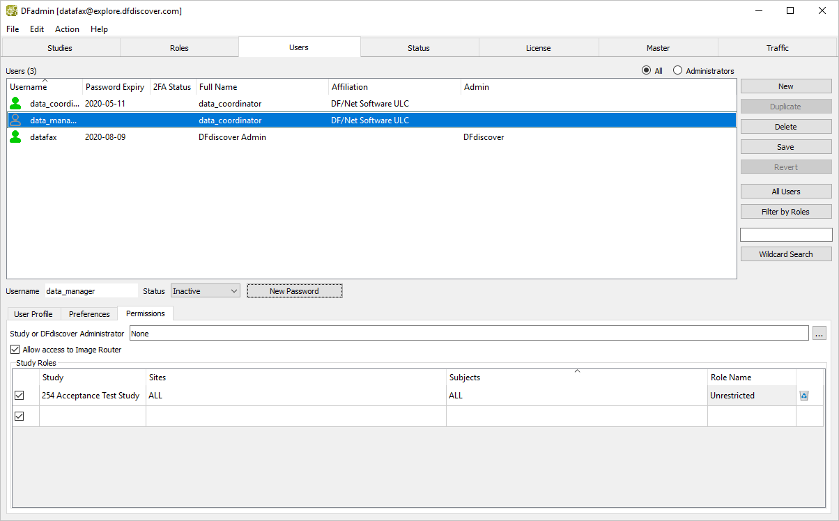 User datafax is already defined on your DFdiscover installation, however, you must grant user datafax a role and permissions to be able to access 254 Acceptance Test Study.