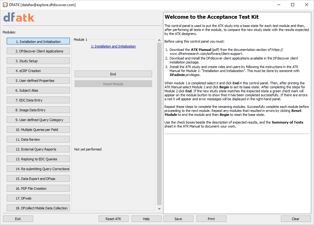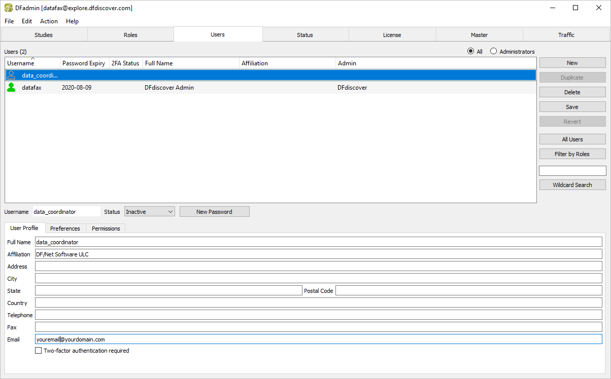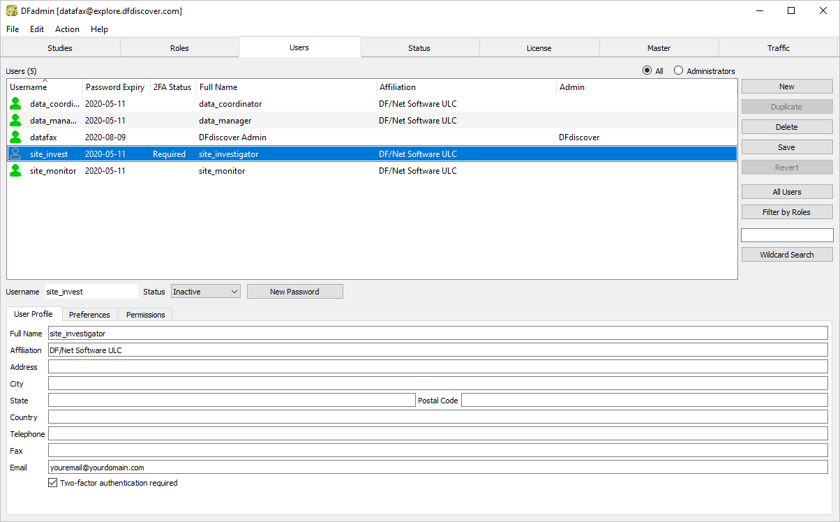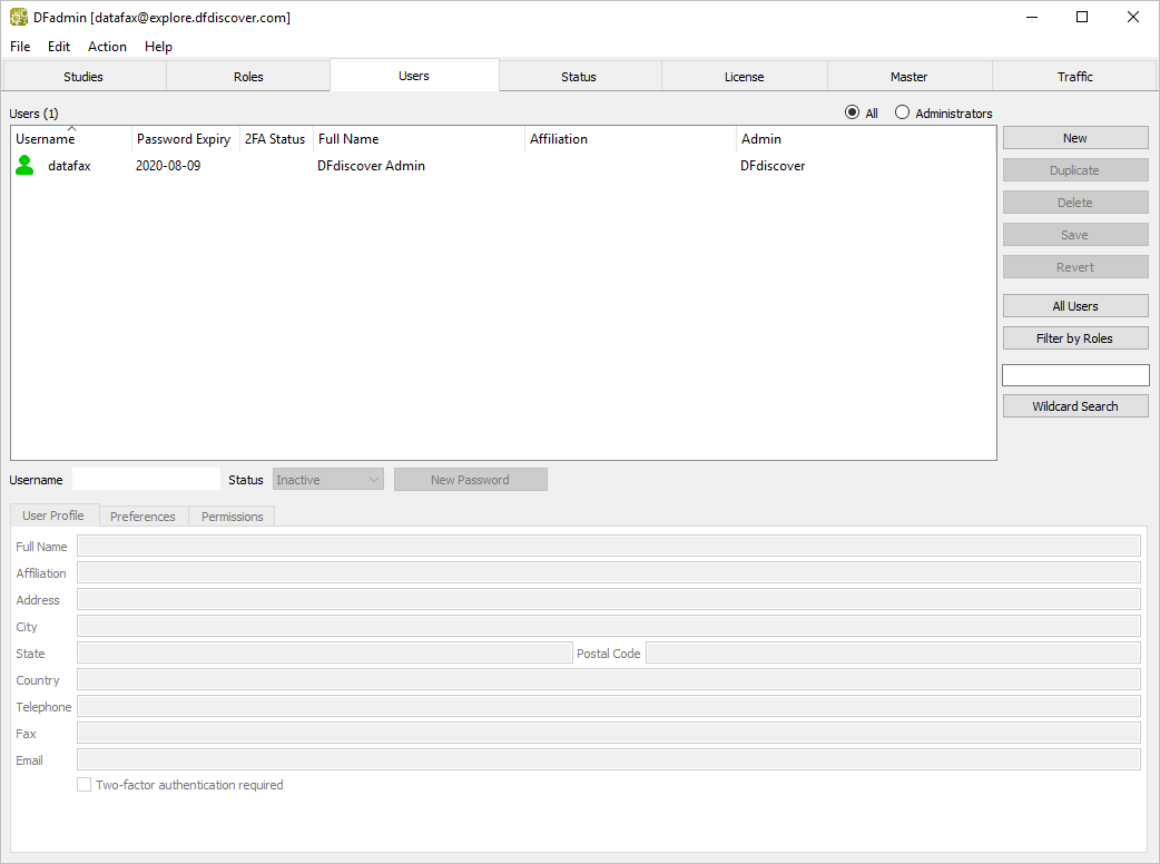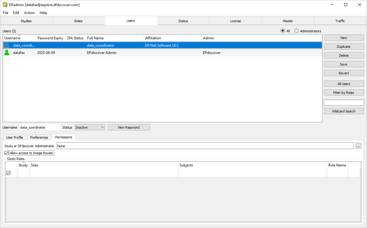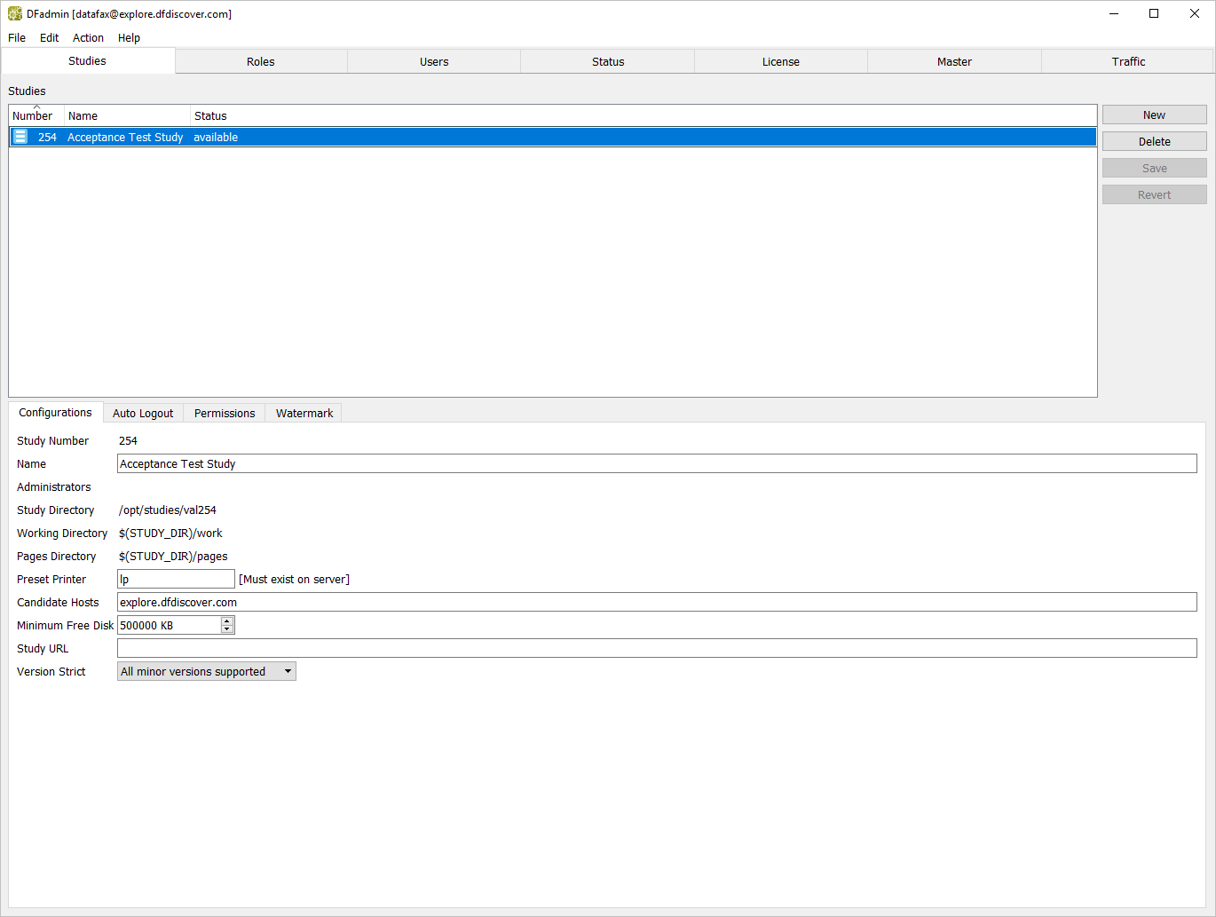 User datafax is already defined on your DFdiscover installation, however, you must grant user datafax a role and permissions to be able to access 254 Acceptance Test Study.