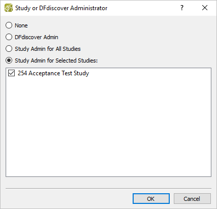 Specify a Full Name of data_manager. Click Permissions tab, then within the Study or DFdiscover Administrator. Select Study Admin for Selected Studies, check (enable) 254 Acceptance Test Study. Click .